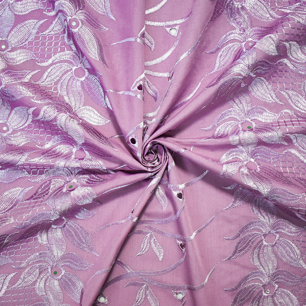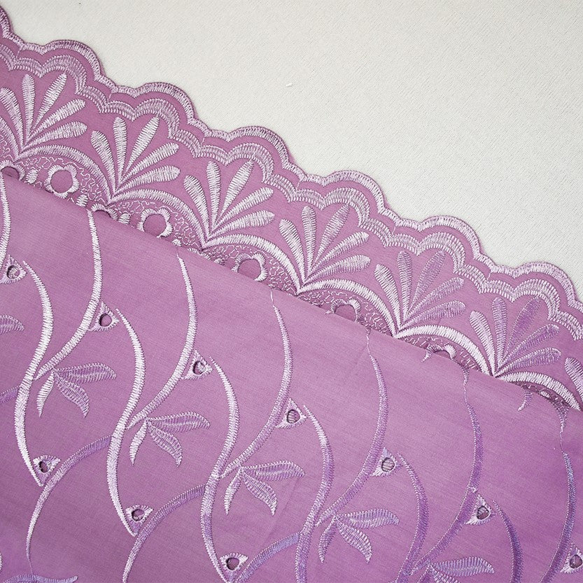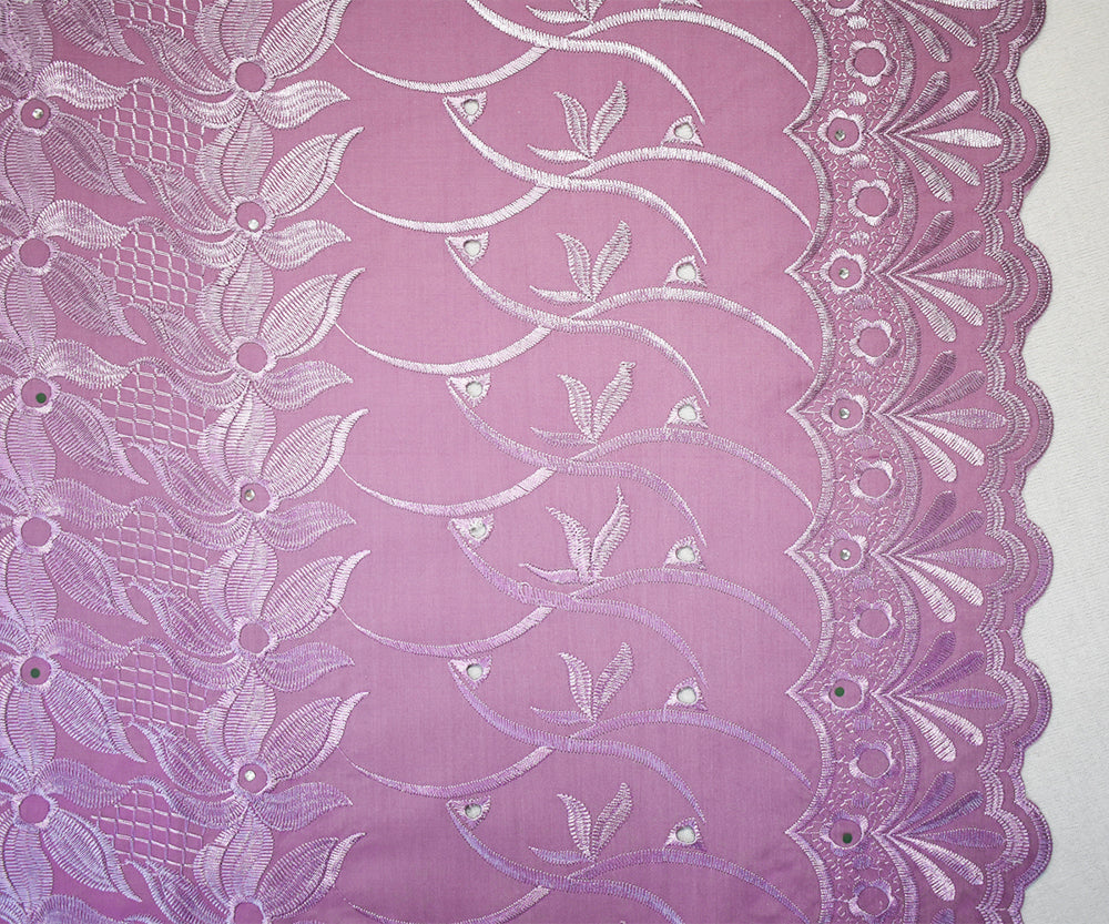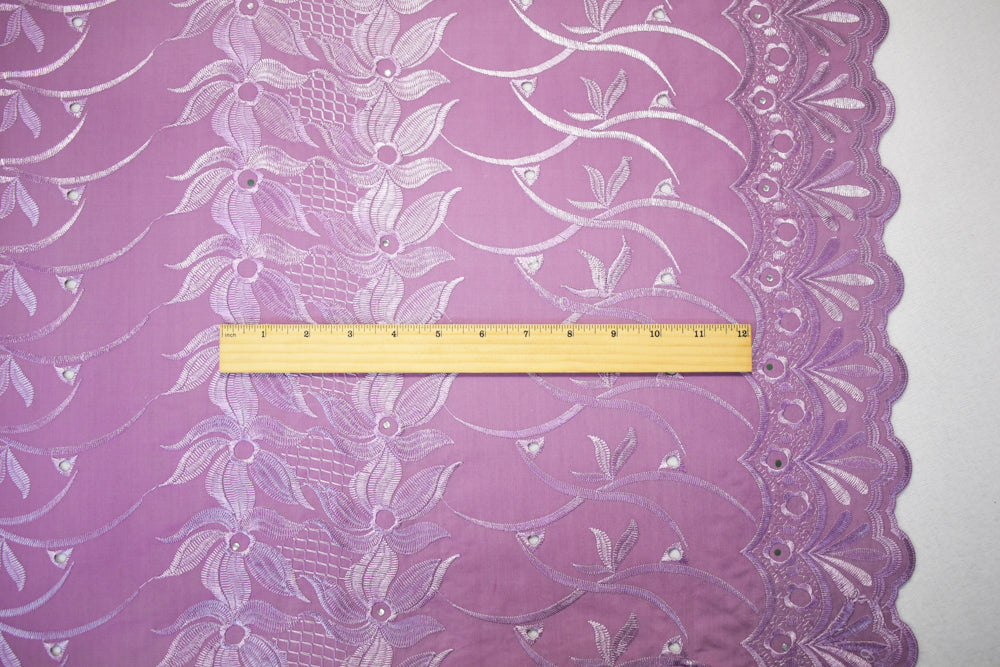 3 3/4 YD PC-Mauve Purple Poly-Cotton Embroidered Floral Scallop Rhinestone Woven Fabric