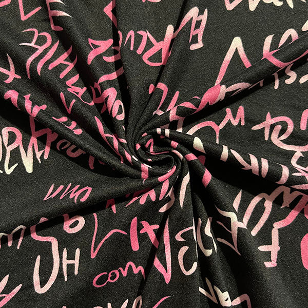 -Shades of Pink Word Print on Black Stretch Double Brushed Knit Fabric