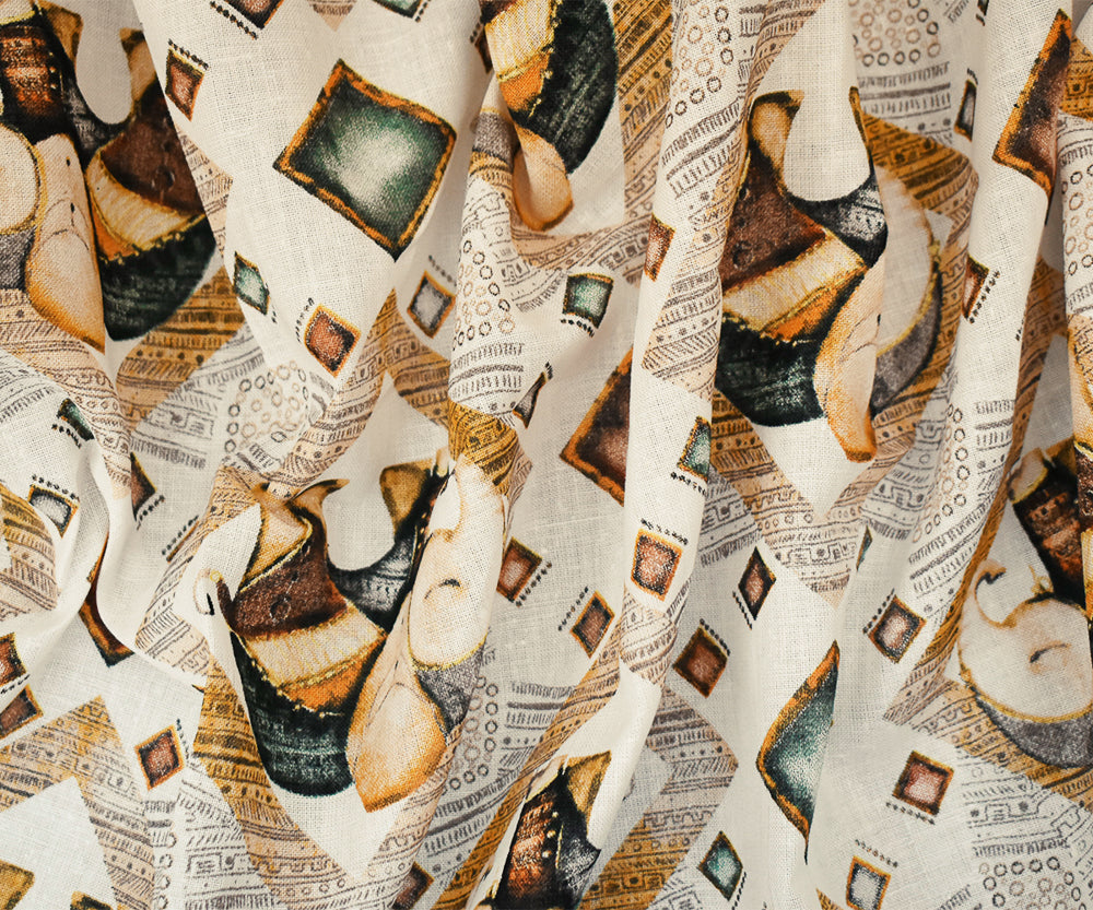 White-Yellow-Multi Elephant Diamond Pattern Printed Linen Woven Fabric