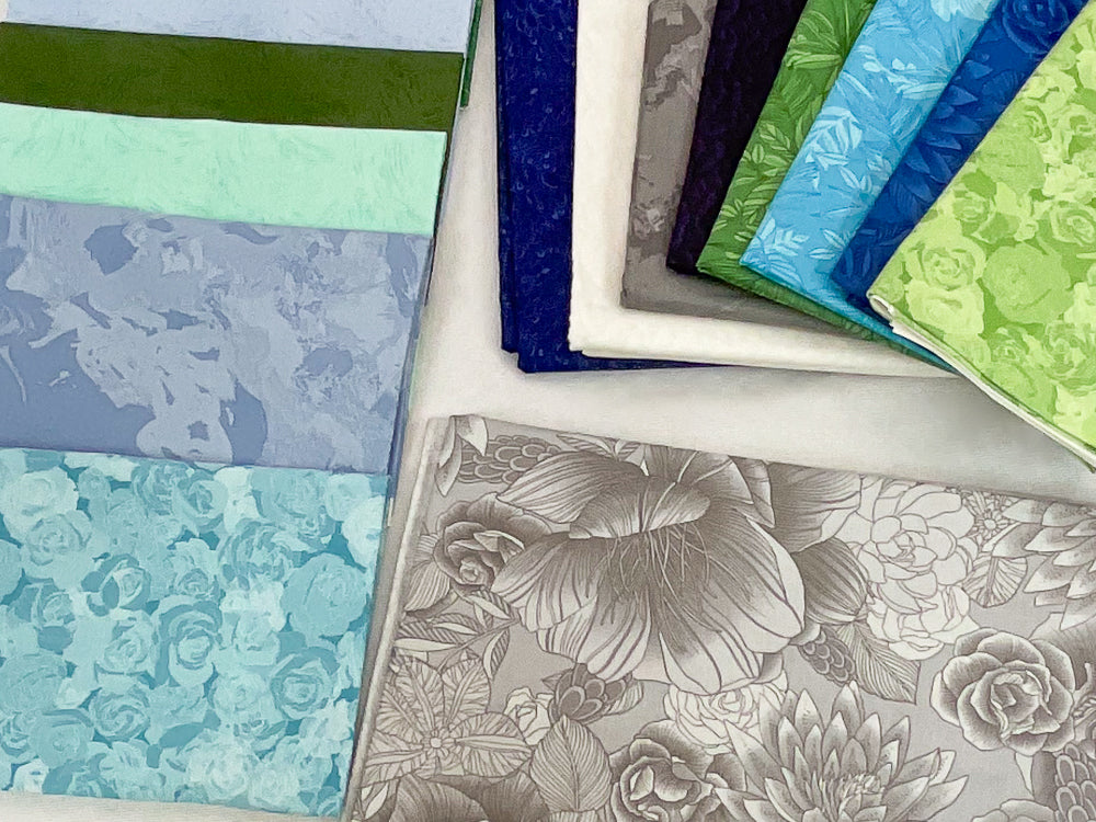- Bundle fabrics include: 3/4 yard gray tonal large floral print, 3/4 yard light gray berry floral print, 3/8 yard mint whisker print, 3/8 yard moss green whisker print, 1/2 yard green bubble print, 1/2 yard sage green rose tonal print, 1/2 yard moss green jungle print, 3/8 yard light blue whisker print, 1/3 yard dusty blue tonal print, 3/8 yard denim blue rose tonal print, 3/8 yard light royal jungle tonal print, 1/2 yard navy large floral print, 1/4 yard purple tonal cloud print, 1 3/4 yard gray marbled print, 2 yards blue water drops print, 2 1/4 yard gray clouds on cream. Pattern is not included.