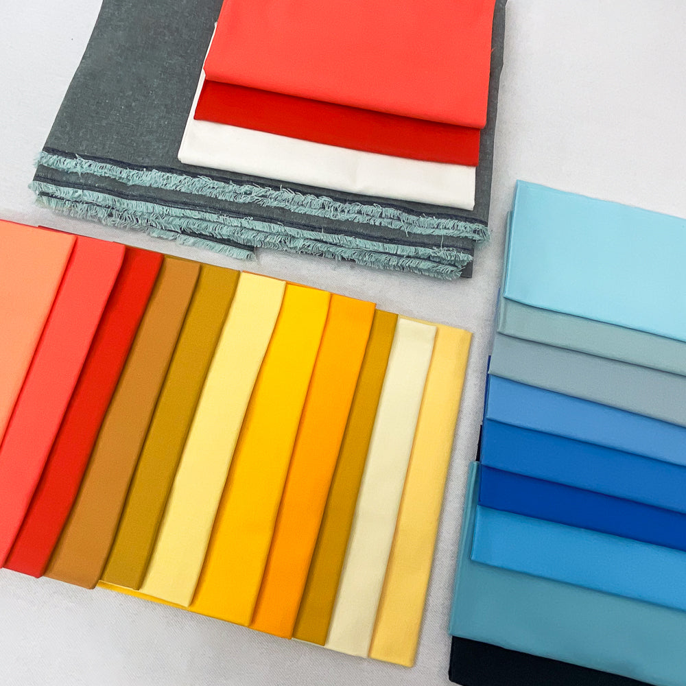 - Kit contents: pattern, many colors of solids as pictured, plus gray woven background fabric. Backing is not included.