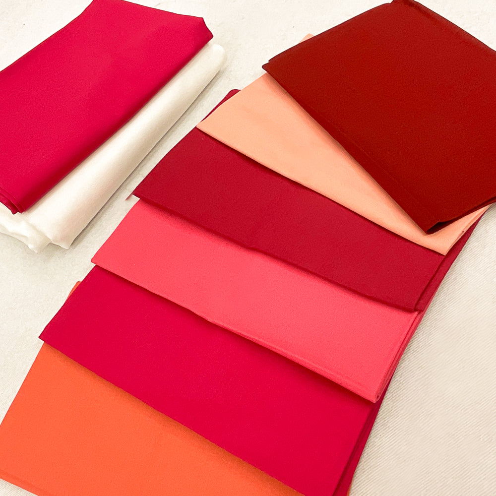 - Bundle fabrics include: 3/4 yard hot pink solid, 1 fat quarter hot pink solid, 1 fat quarter peach solid, 1 fat quarter red solid, 1 fat quarter deep red solid, 1 fat quarter orange solid, 1 fat quarter pink solid, 3 1/2 yards white solid. Pattern is not included.