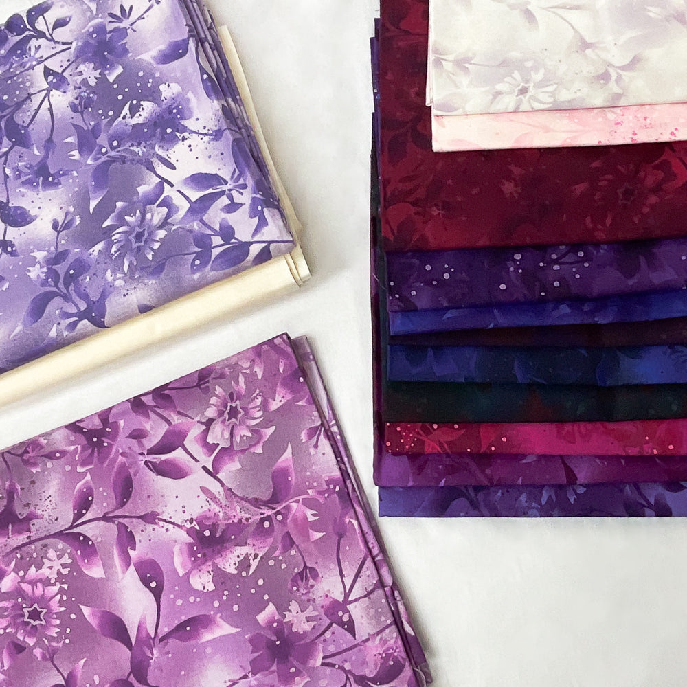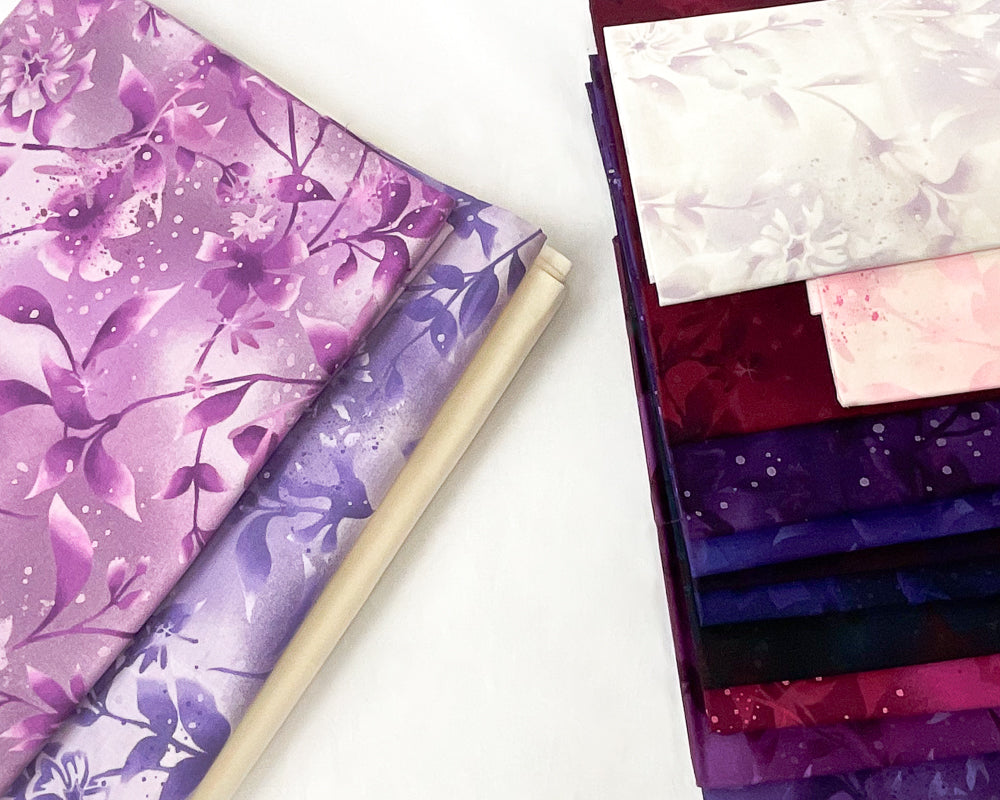 - Bundle fabrics include: 5/8 yard multi tonal, 5/8 yard purple tonal, 5/8 yard wine tonal, 3/4 yard periwinkle tonal, 3/4 yard raspberry tonal, 1/2 yard light pink white tonal, 1/2 yard lilac white tonal, 7/8 yard lavender tonal, 1 yard dark purple tonal, 1 yard maroon tonal, 1 yard cranberry tonal, 1 1/4 yard eggplant tonal, 1/8 yard light lilac tonal, 1 1/4 yard multi purple tonal, 2 3/4 yard dusty purple tonal, 4 5/8 yards cream solid. Pattern is not included.
