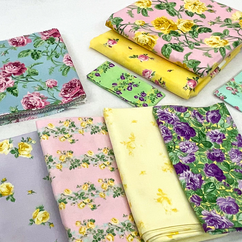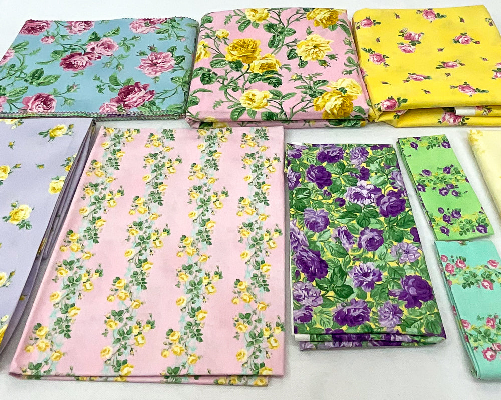 - Bundle fabrics include: 3/4 yard light pink yellow multi floral stripe, 2 1/2 yards pink yellow medium floral, 2 1/8 yards sunshine yellow pink rose, 1 1/4 yards lavender purple yellow rose, 1 1/8 yards yellow tonal rose, 1/3 yard purple yellow green floral garden, 1/8 yard green purple floral stripe, 1/8 yard teal pink multi floral stripe, 1/4 yard blue pink multi floral, 1/4 yard pink green multi floral, 1/4 yard sky blue pink green floral dots, 1/4 yard blue pink rose, 1/4 yard pink yellow medium floral, 1/4 yard pink yellow green scattered floral, 1/4 yard pink yellow teal floral stripe, 1/4 yard pink floral butterfly, 1/4 yard mint teal pink floral butterfly, 1/4 yard green purple medium floral. Pattern is not included.