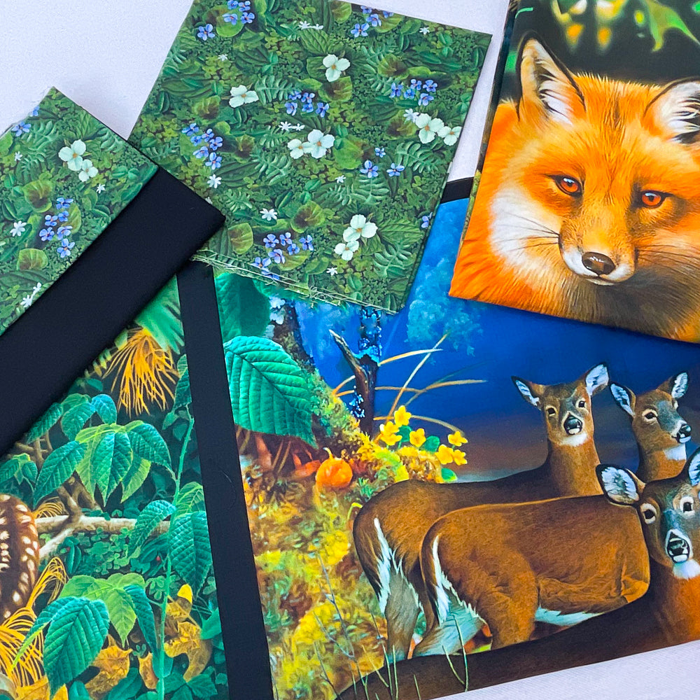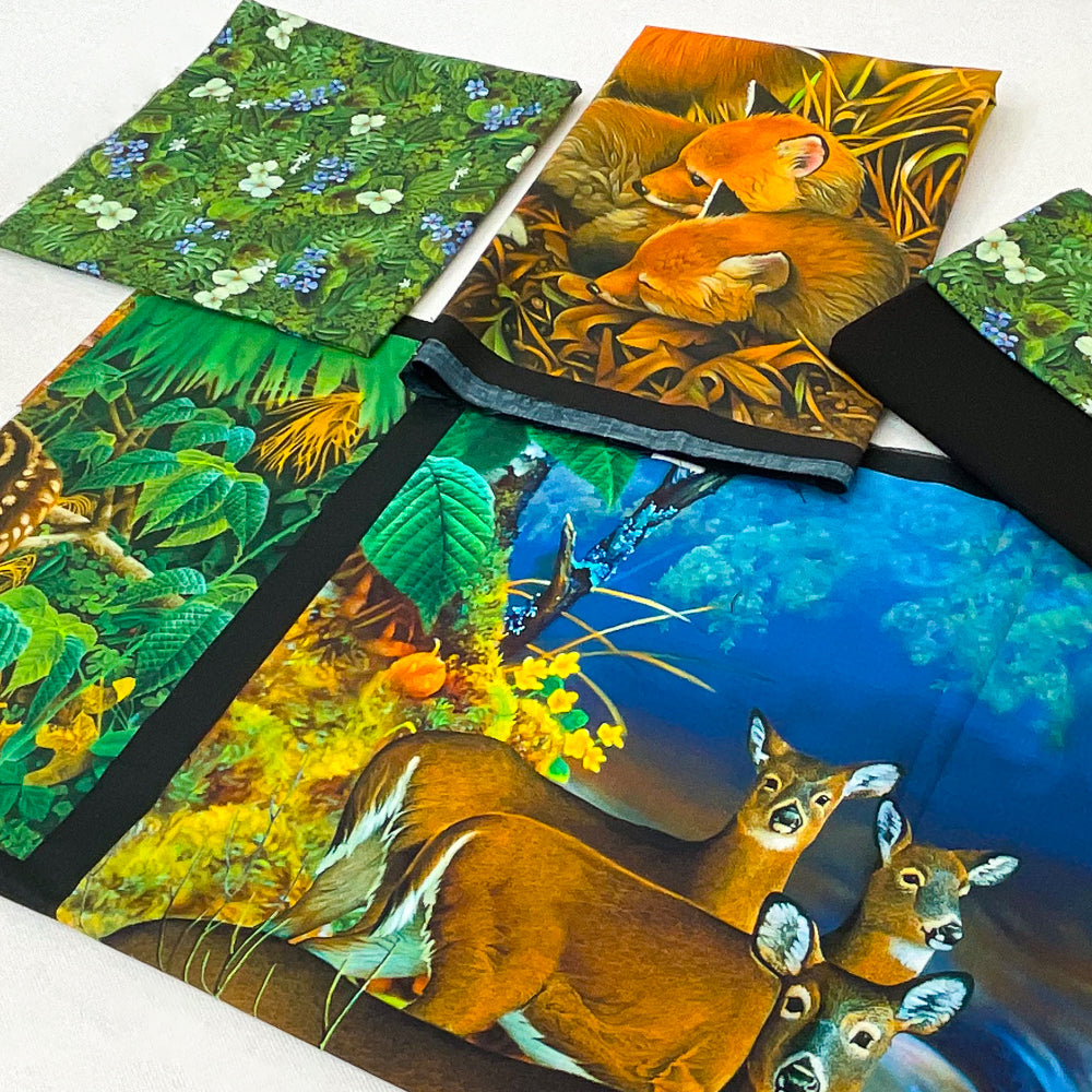 - Kit fabrics include: 1 fat quarter forest green multi forest print, 1 1/8 yards black solid, 1/2 yard forest green multi forest print, plus 2 animal panels.