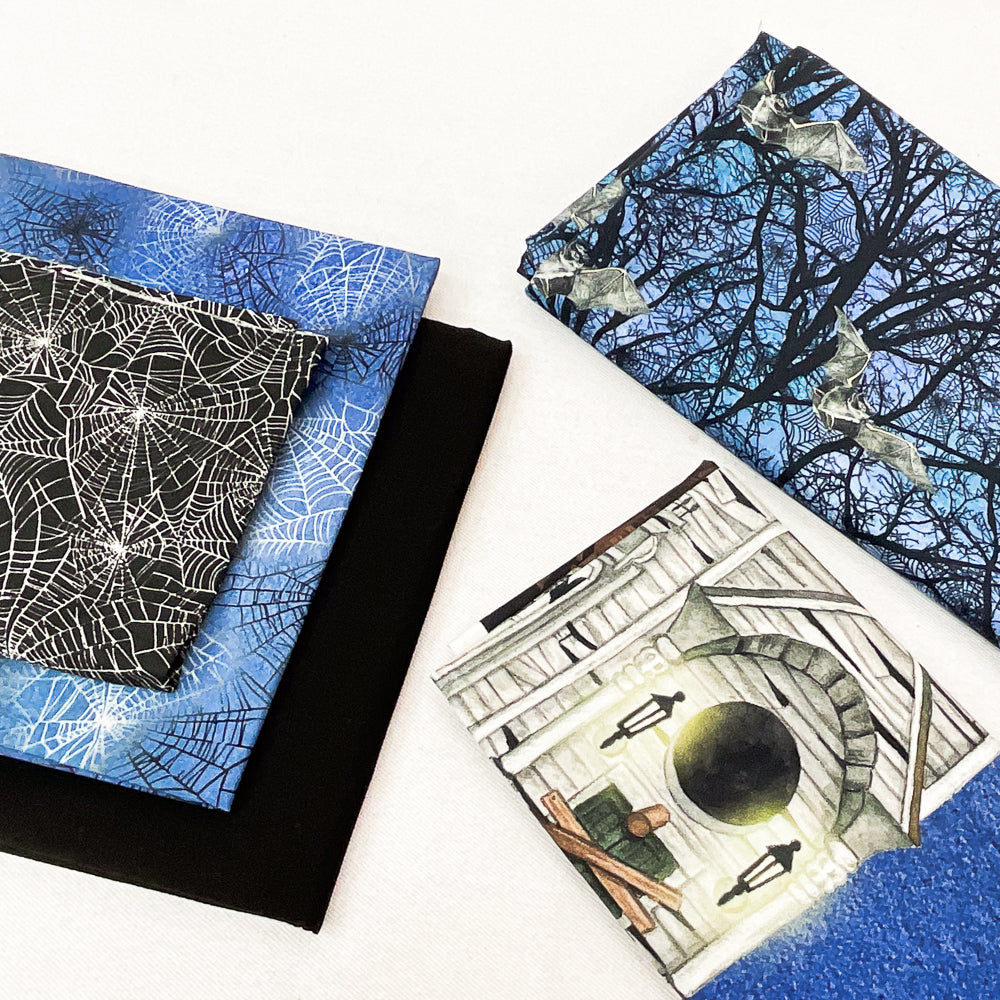 - Kit includes: 1/3 yard black spider web print, 1/2 yard denim spider web print, 1/4 yard raven moon print, 1 yard black solid, 1 1/2 yards multi-color bat spiderweb tree print.