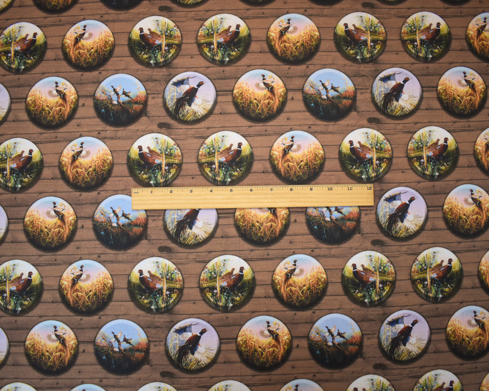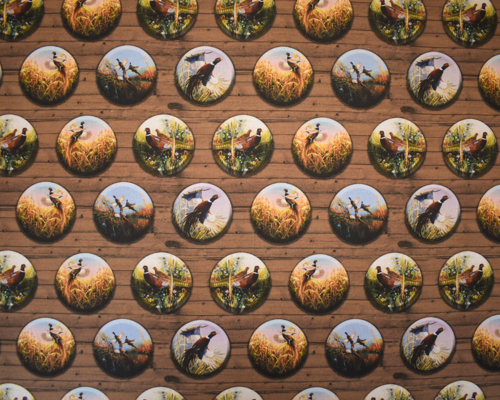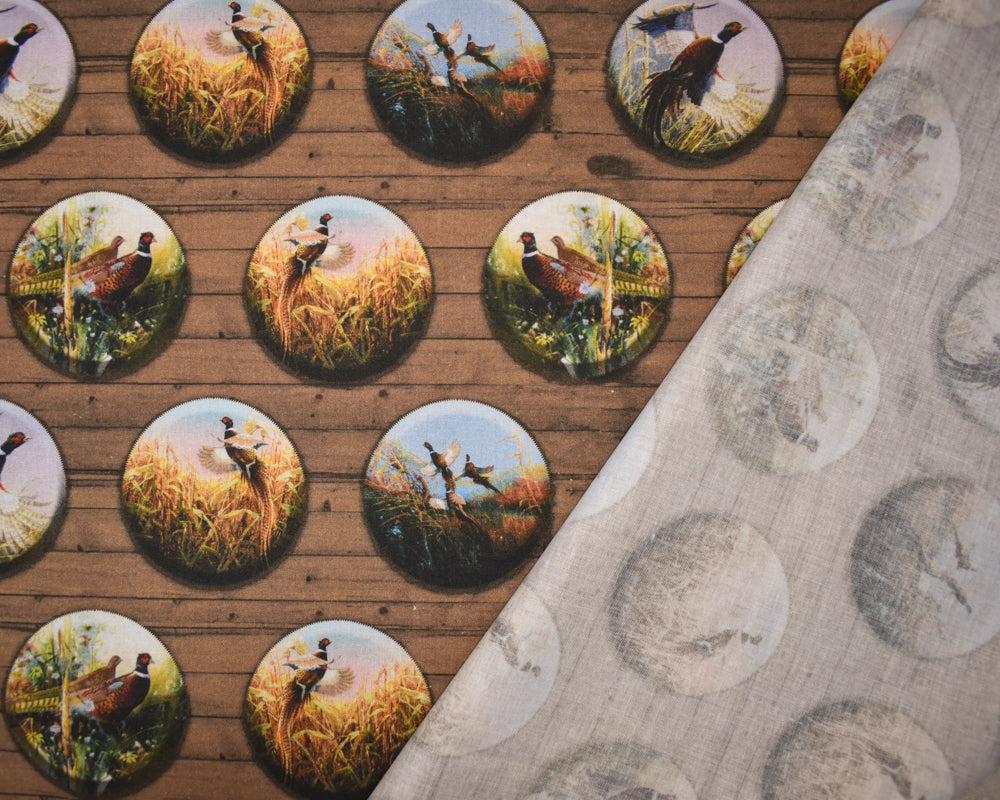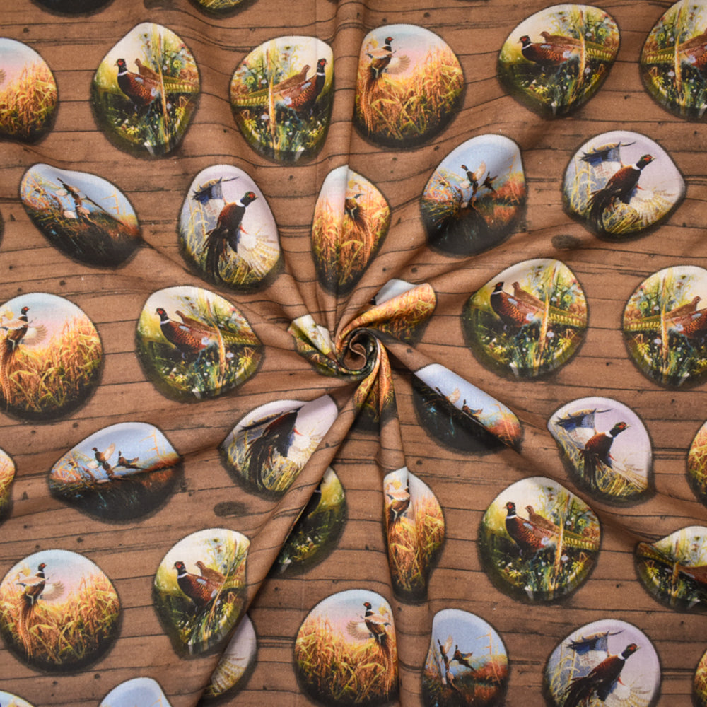 -Brown-Multi Cotton Pheasant Badges Printed Quilting Woven Fabric