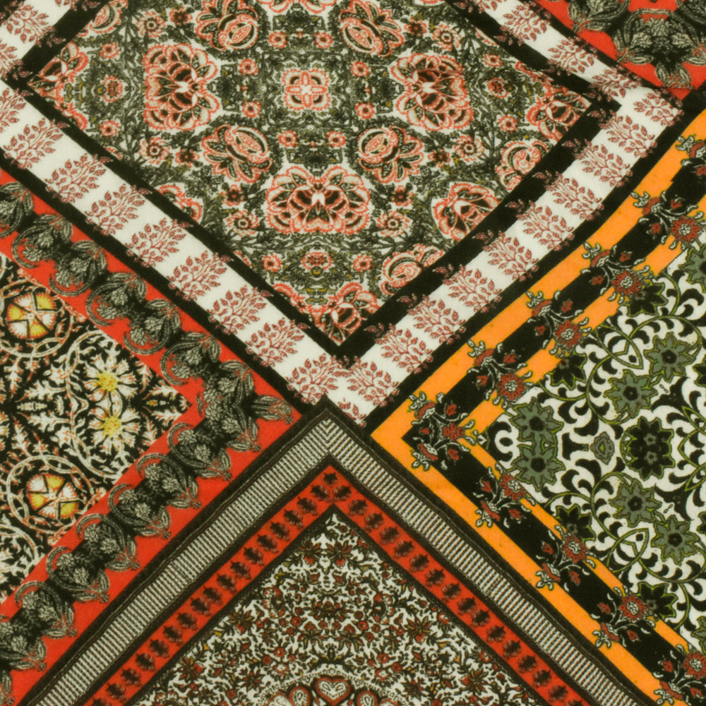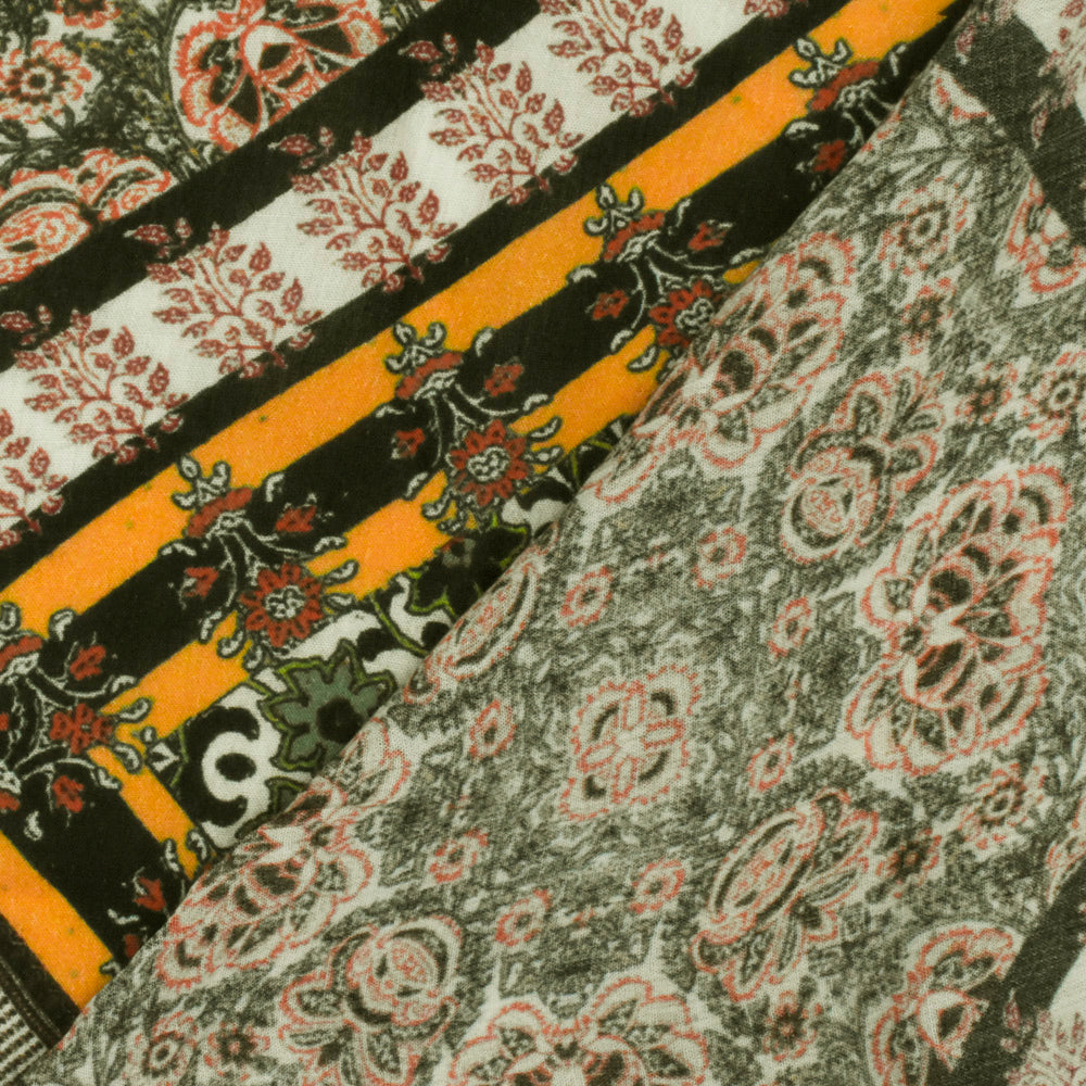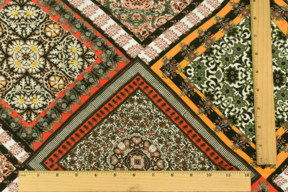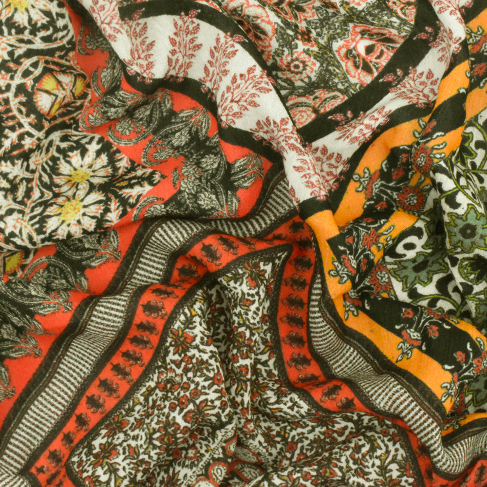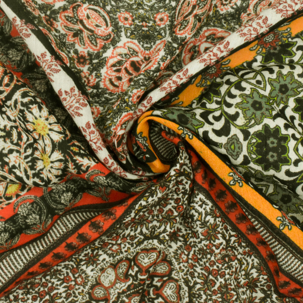 Orange-Yellow-Multi Famous Designer Patch Printed Rayon Challis Fabric