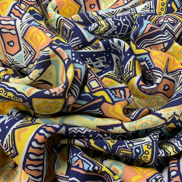-Blue, White, Peach, Yellow, & Navy Blue Multi Aztec Print Rayon Challis Fabric