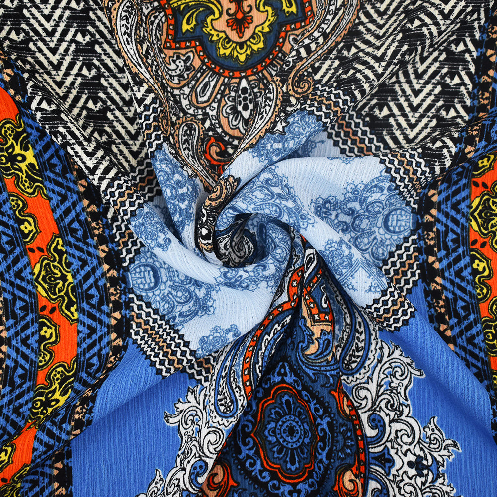 Blue-Orange-Multi Baroque Printed Poly Crepe Georgette Woven Fabric