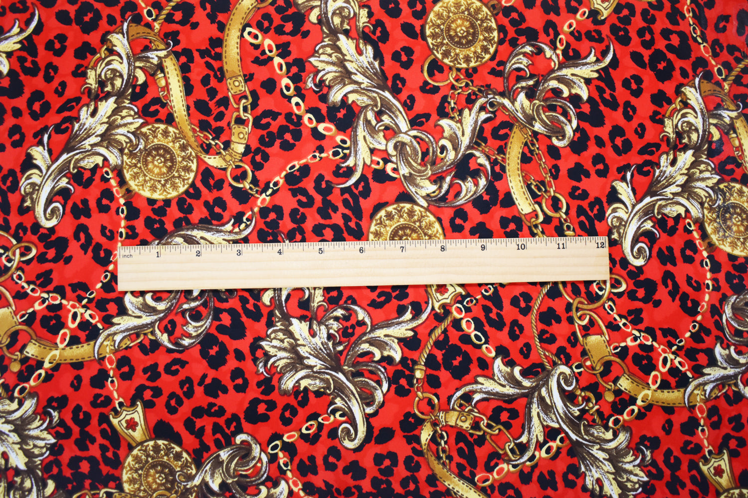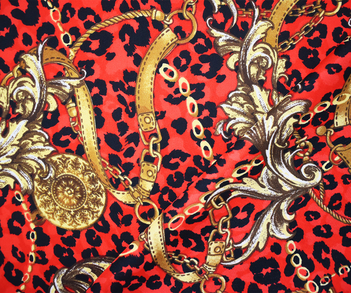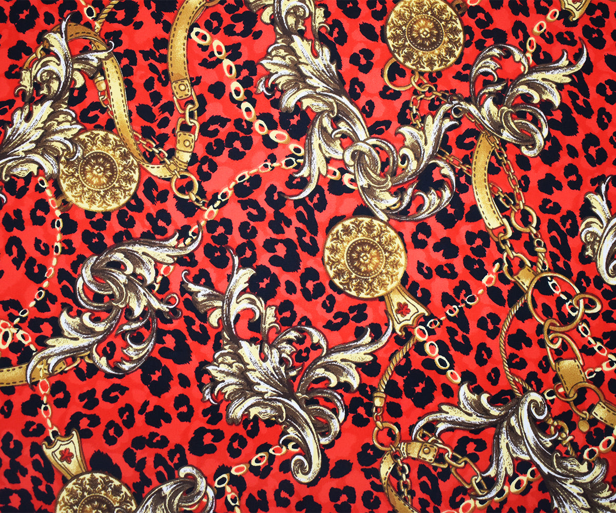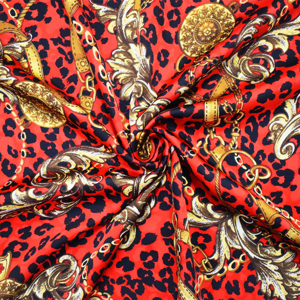 Red-Yellow-Black Poly Baroque with Leopard Printed Charmeuse Satin Woven Fabric
