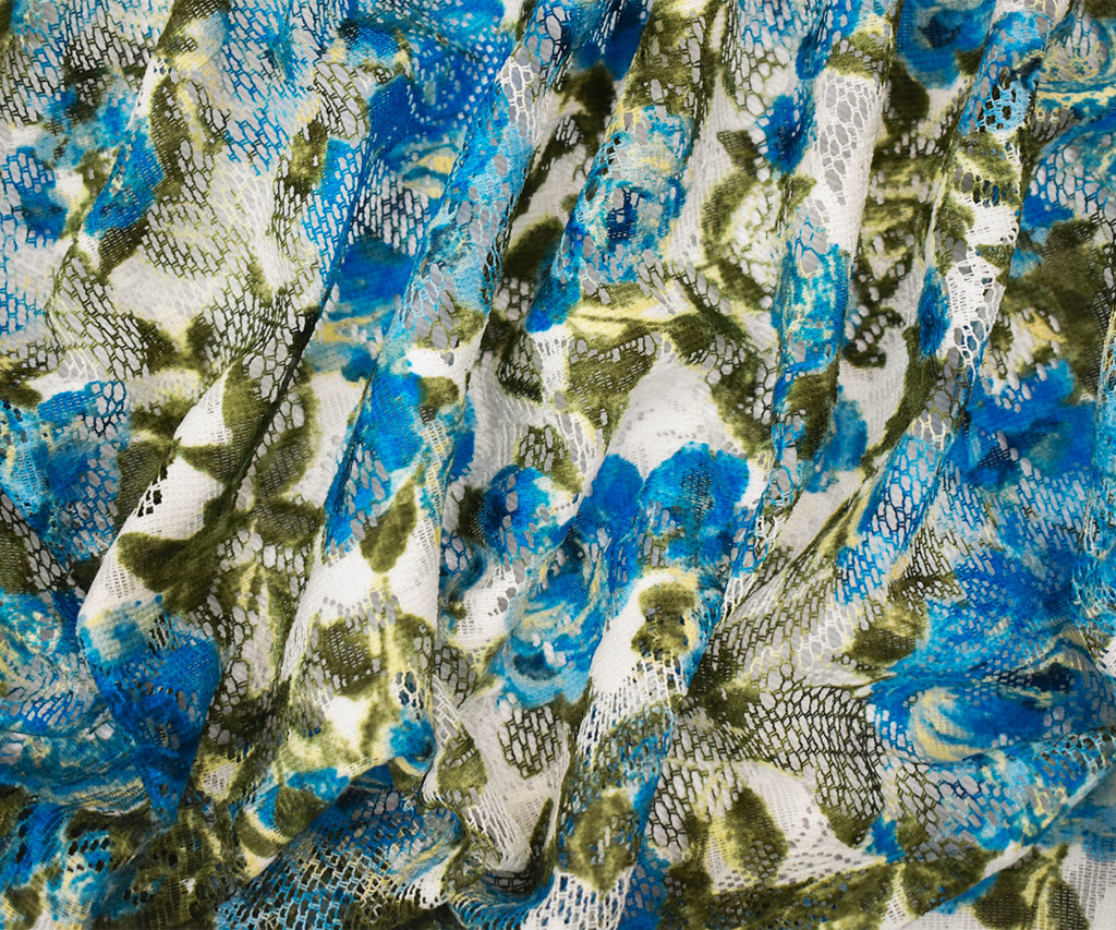 Blue-Green-Multi Poly Nylon Floral Printed Crochet Lace Mesh Knit Fabric