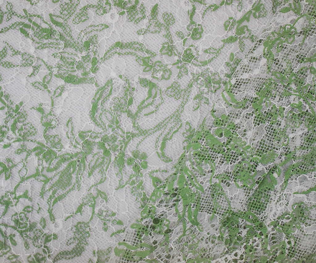 White-Green Nylon Floral Vine Printed Lace Mesh Knit Fabric