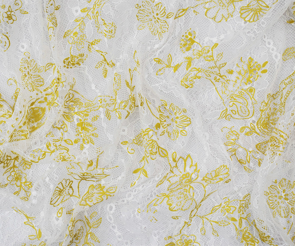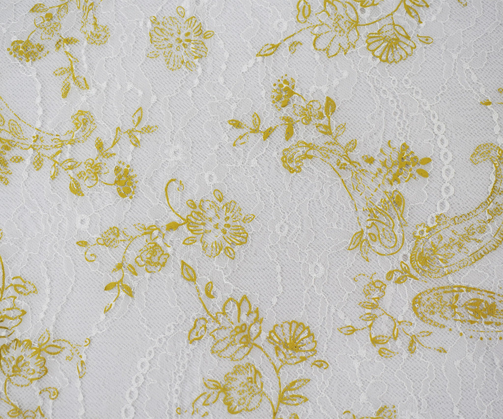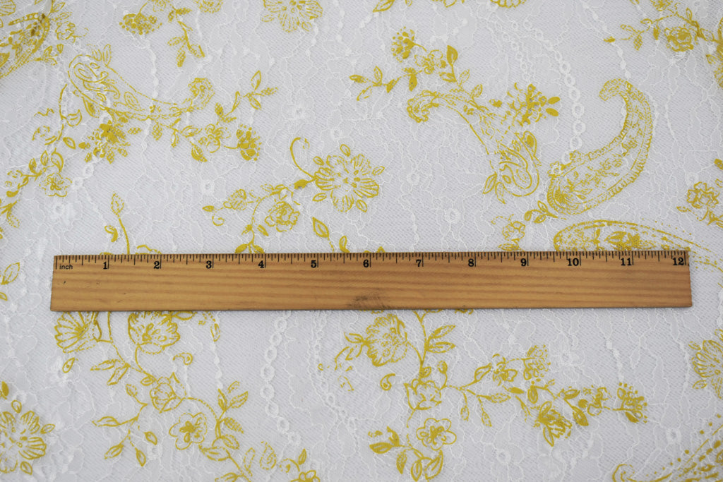 White-Yellow Nylon Floral Paisley Printed Lace Mesh Knit Fabric