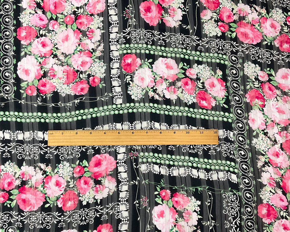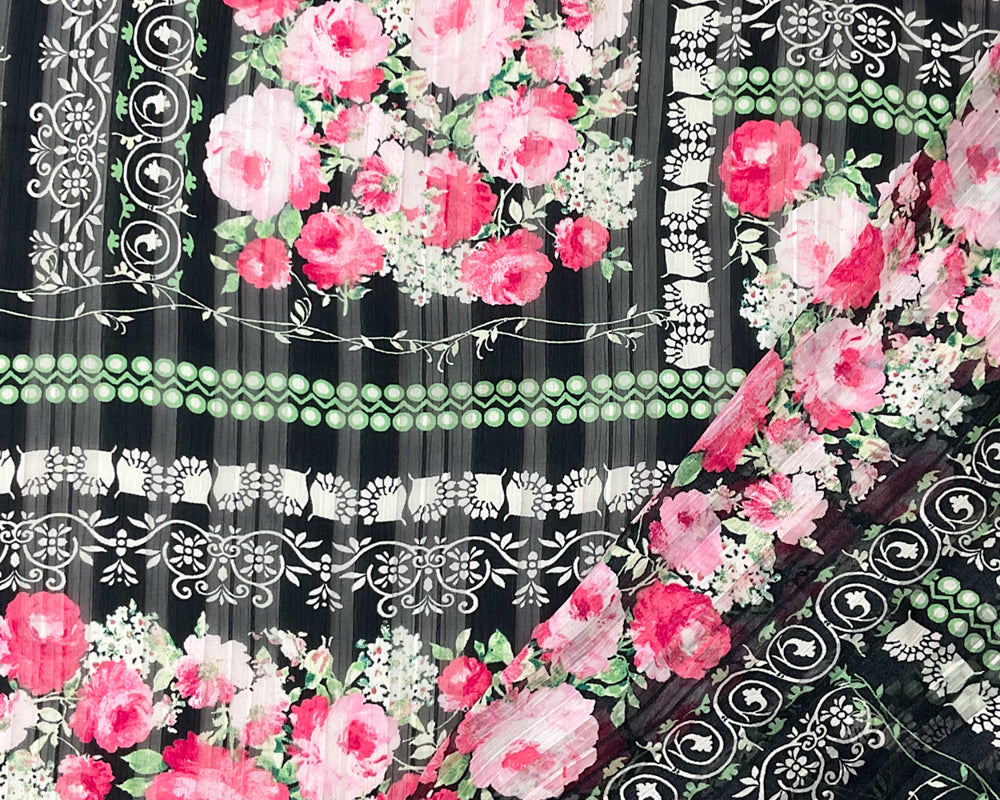 Black-Multi Poly Floral Printed Stripe Satin Chiffon Woven Fabric