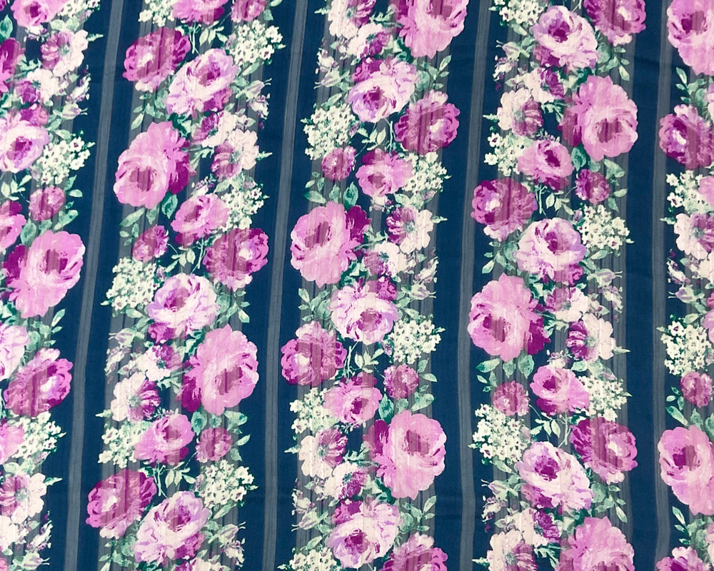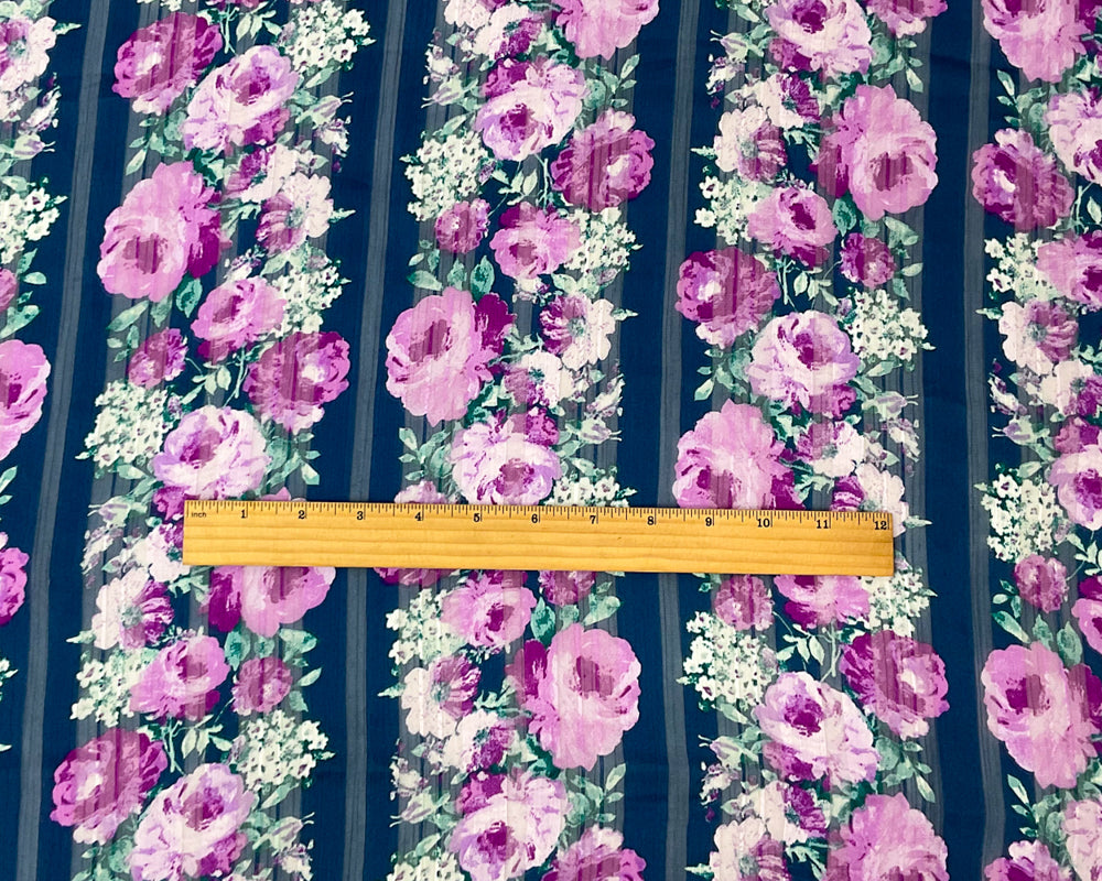 Blue-Multi Poly Floral Printed Satin Stripe Chiffon Woven Fabric