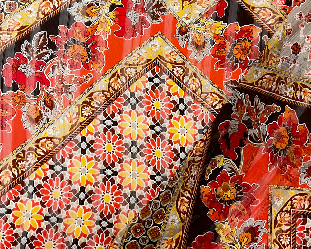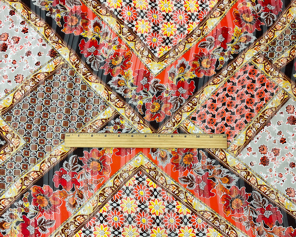 Brown-Multi Poly Floral Printed Satin Stripe Chiffon Woven Fabric