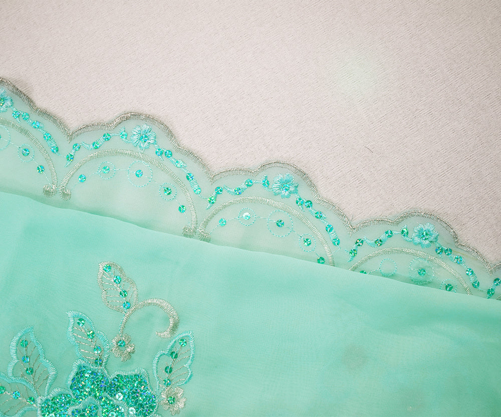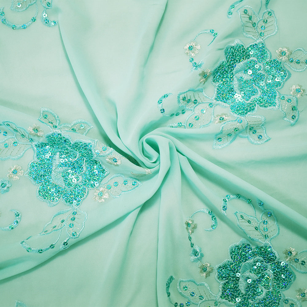 Aqua-Silver Nylon Embroidered Floral Sequined Scallop Chiffon Woven Fabric