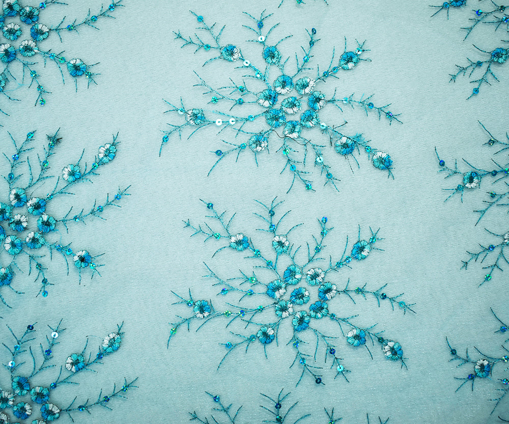 Aqua Teal-White Nylon Embroidered Floral Sequin Scallop Mesh Tulle Fabric