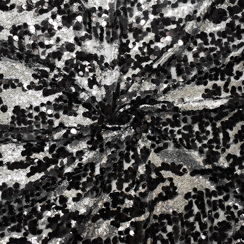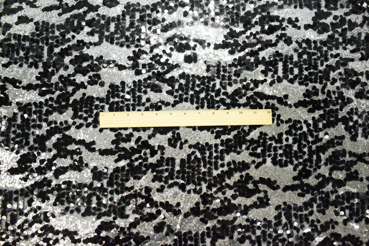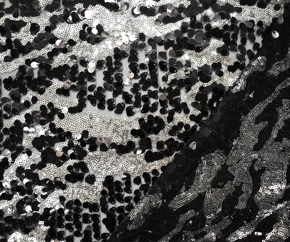 Black-Metallic Silver Nylon Abstract Sequin Tulle Mesh Fabric