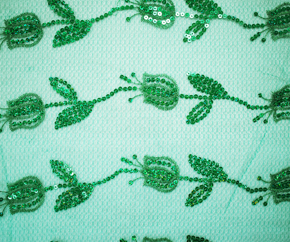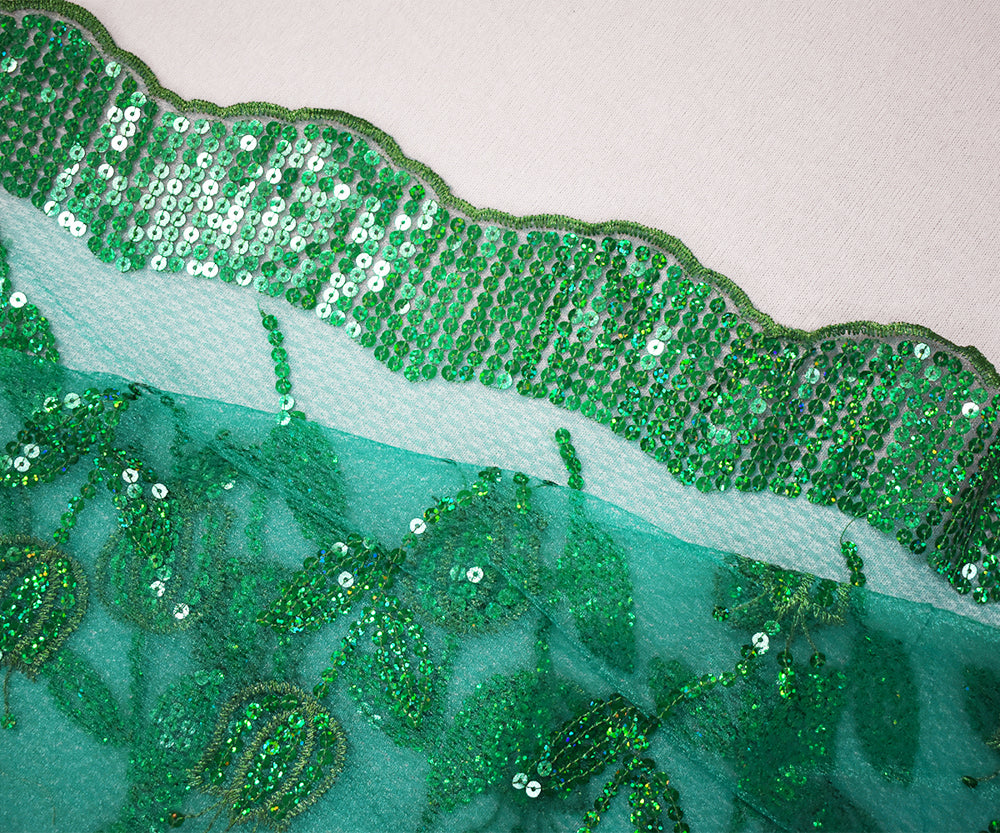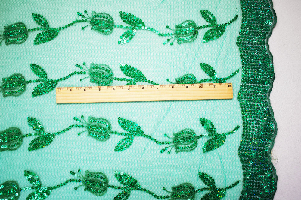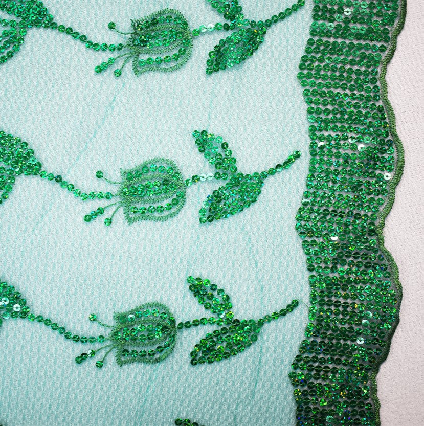 Green Nylon Embroidered Floral Tullip Sequin Scallop Tulle Mesh Fabric