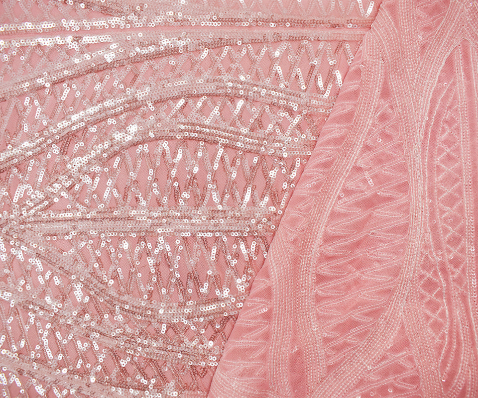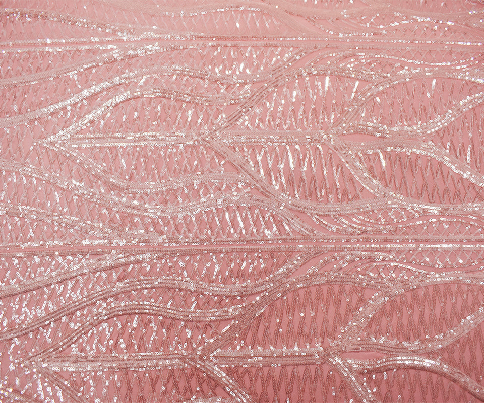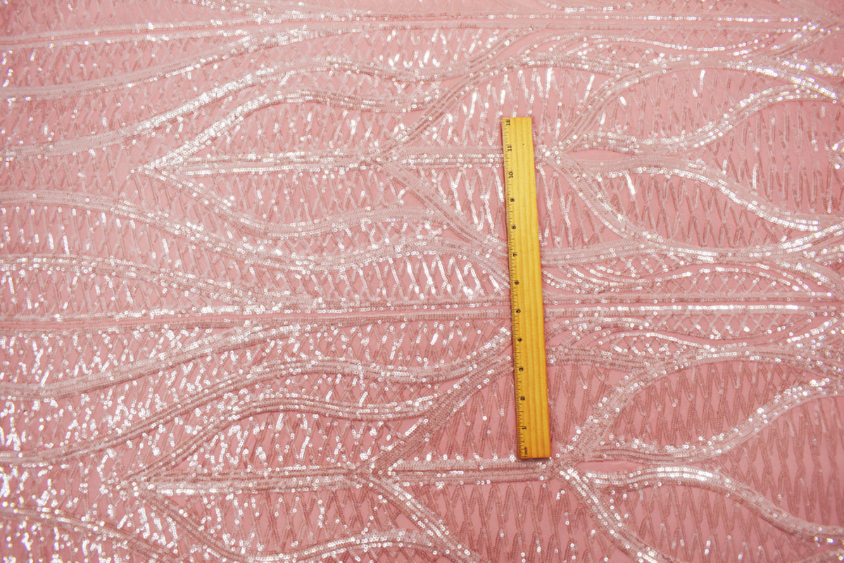 Pink-Pearl-Iridescent Nylon Abstract Wave Sequined Mesh Knit Fabric