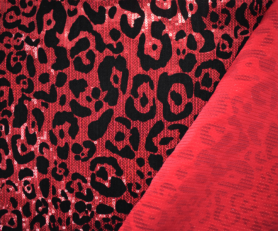 Red-Black Poly Velvet Flock Cheetah Print Sequin Stretch Knit Fabric