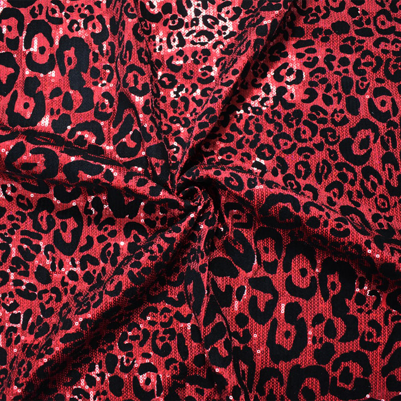 -Polyester fully sequined stretch spandex knit fabric with a velvet flocked leopard print
