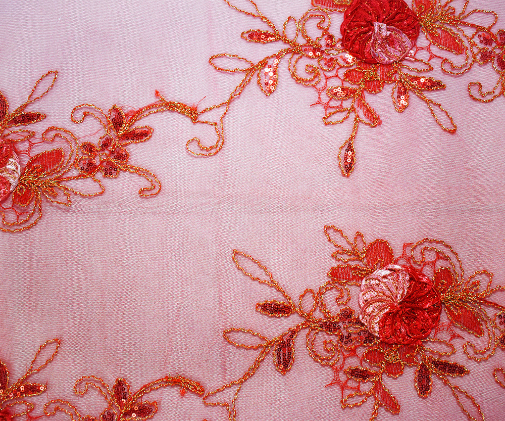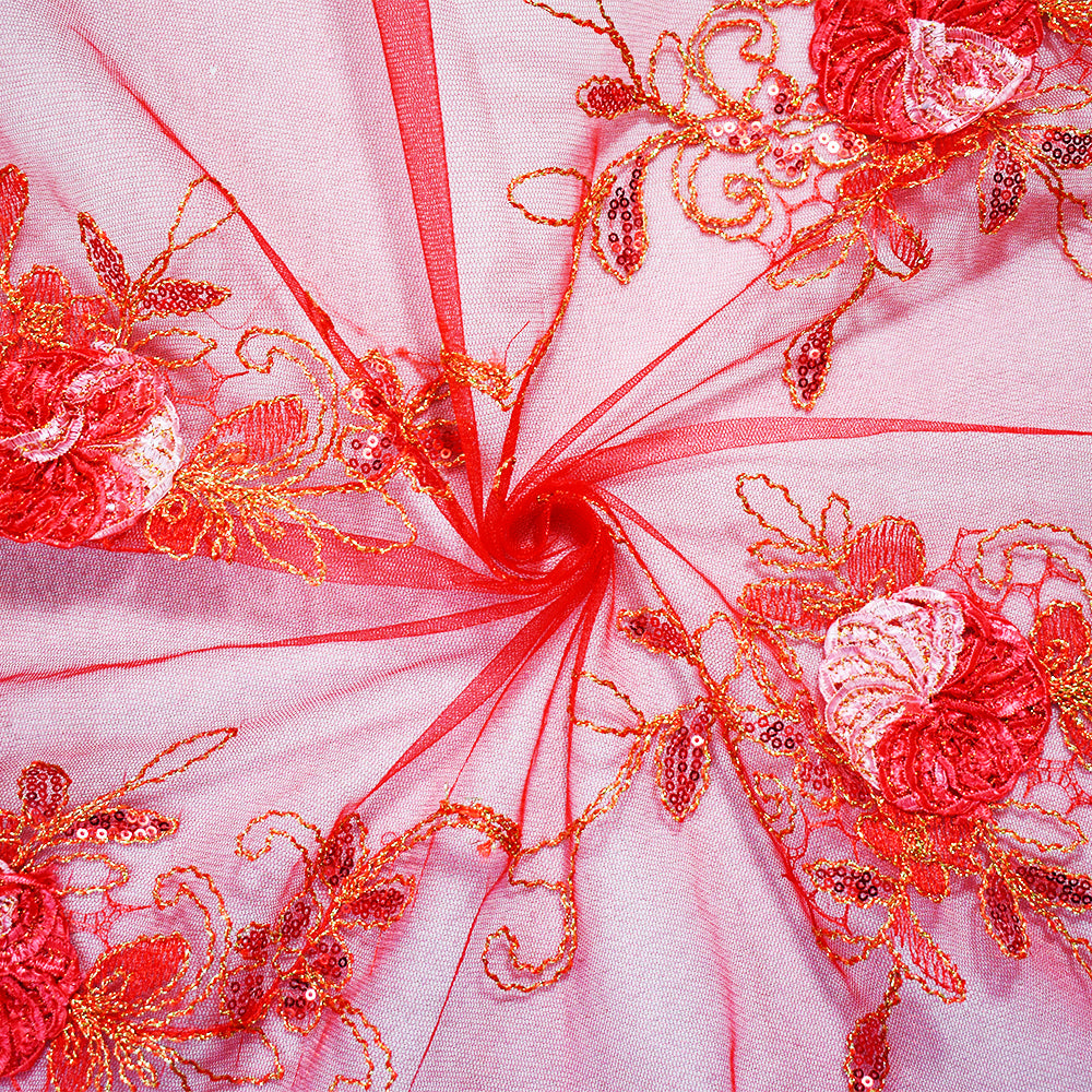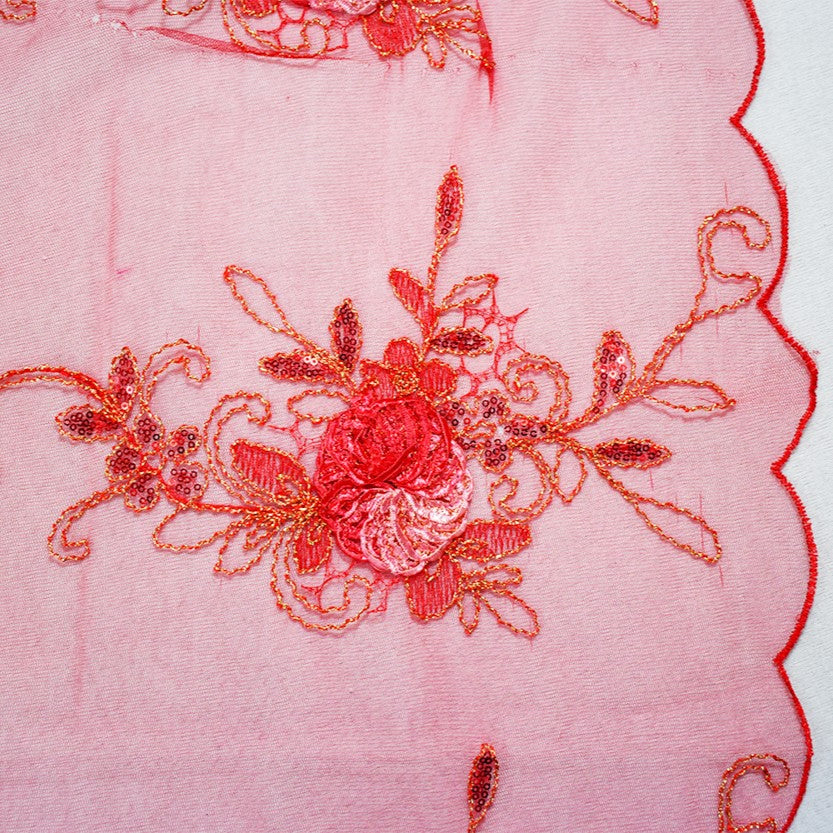 Red-Multi Nylon Embroidery Applique-Sequin Floral Scallop Tulle Fabric