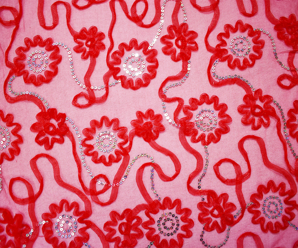 Red-Silver Nylon Floral Applique Sequined Mesh Tulle Fabric