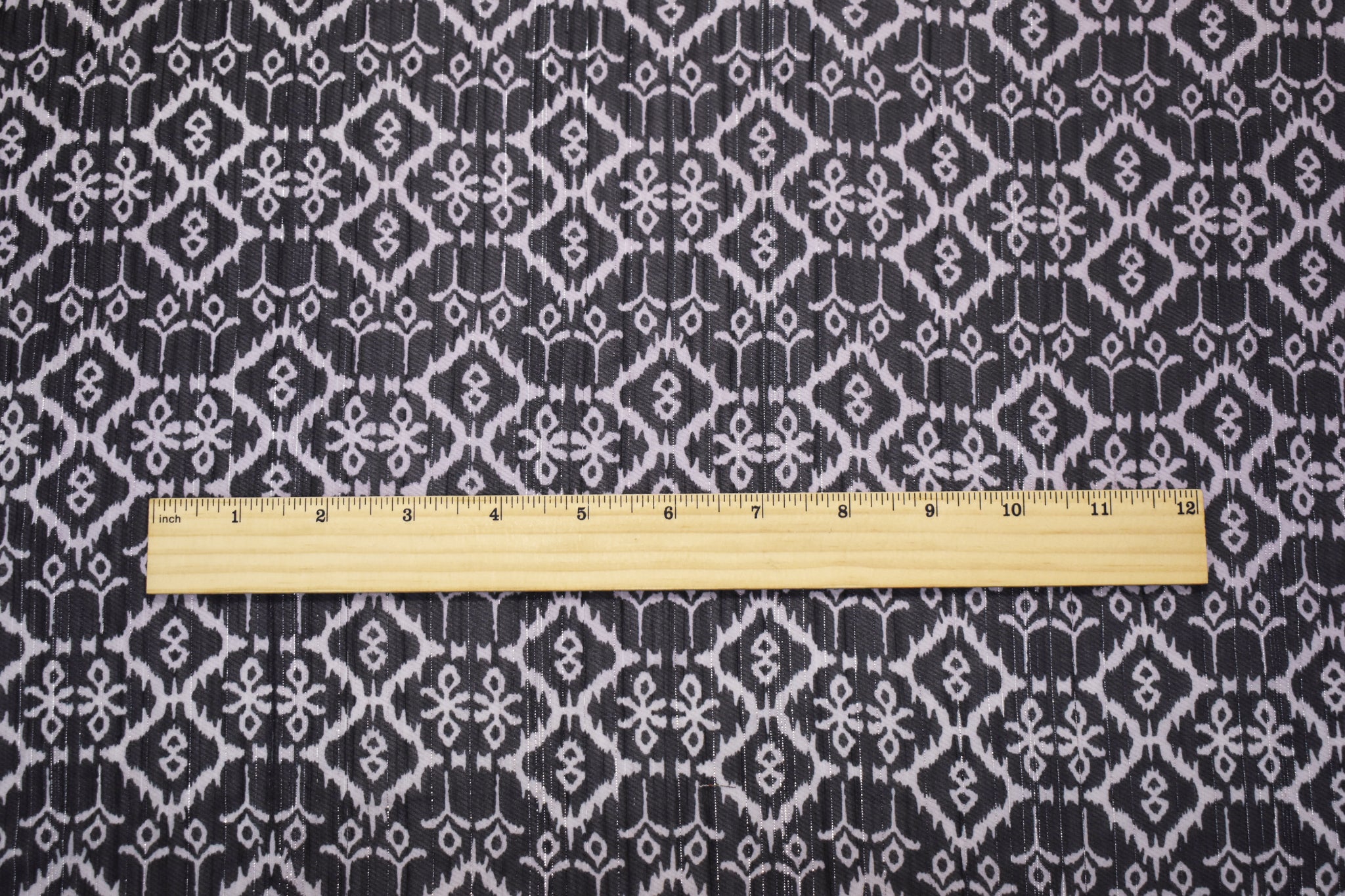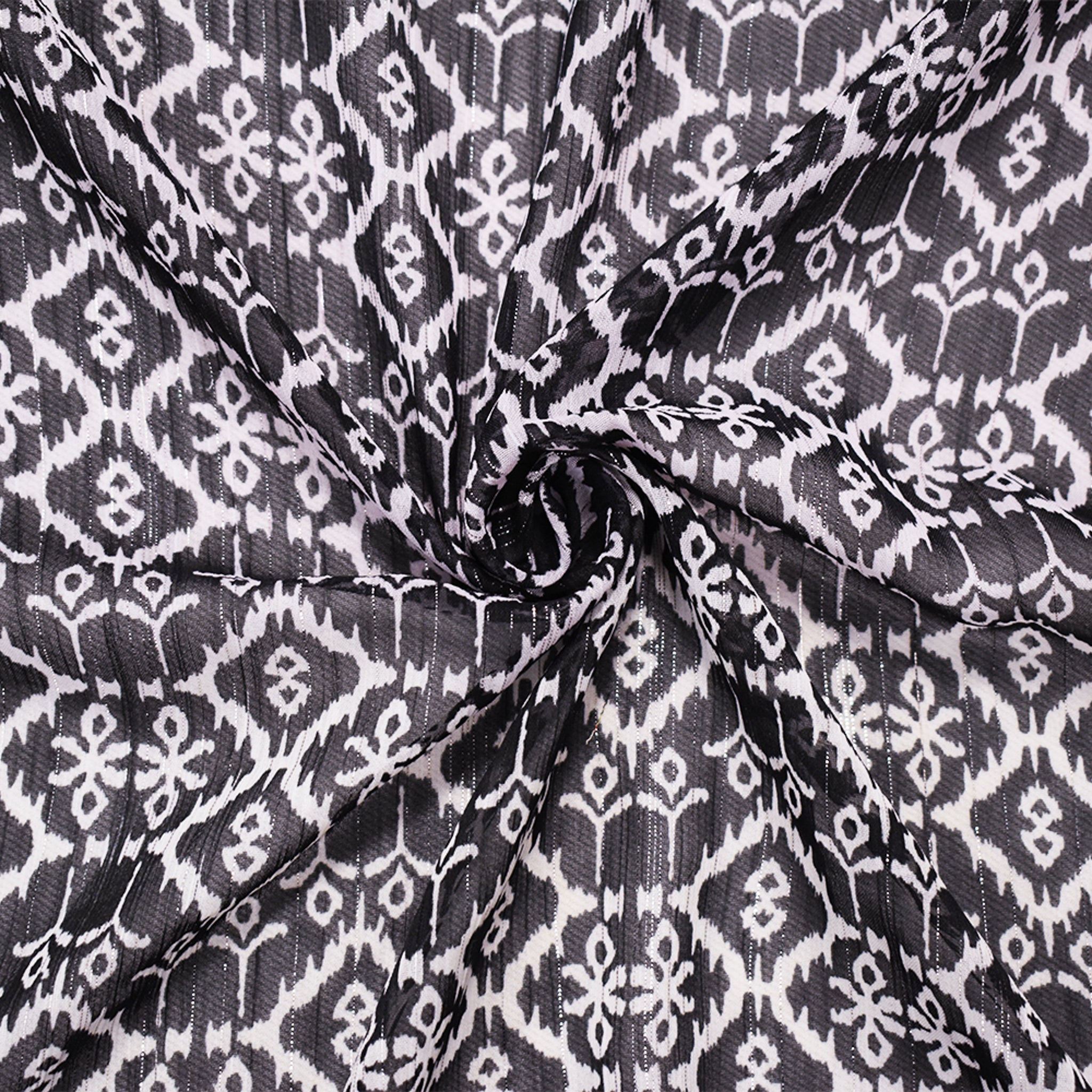 Black-Purple Poly Tile Abstract Ikat Printed Silver Stripe Chiffon Fabric