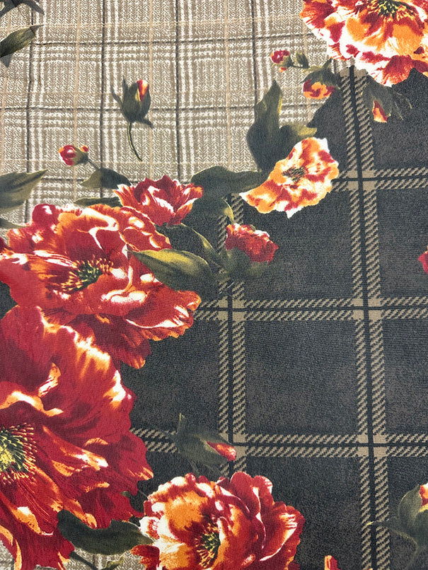 Brown Plaid Floral Print Poly Chiffon Fabric