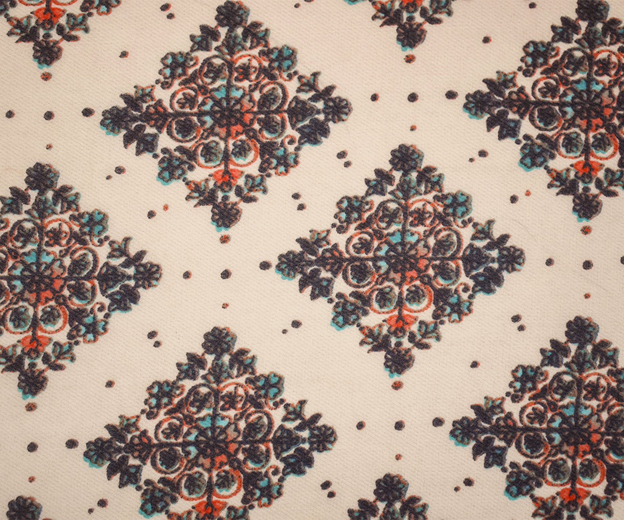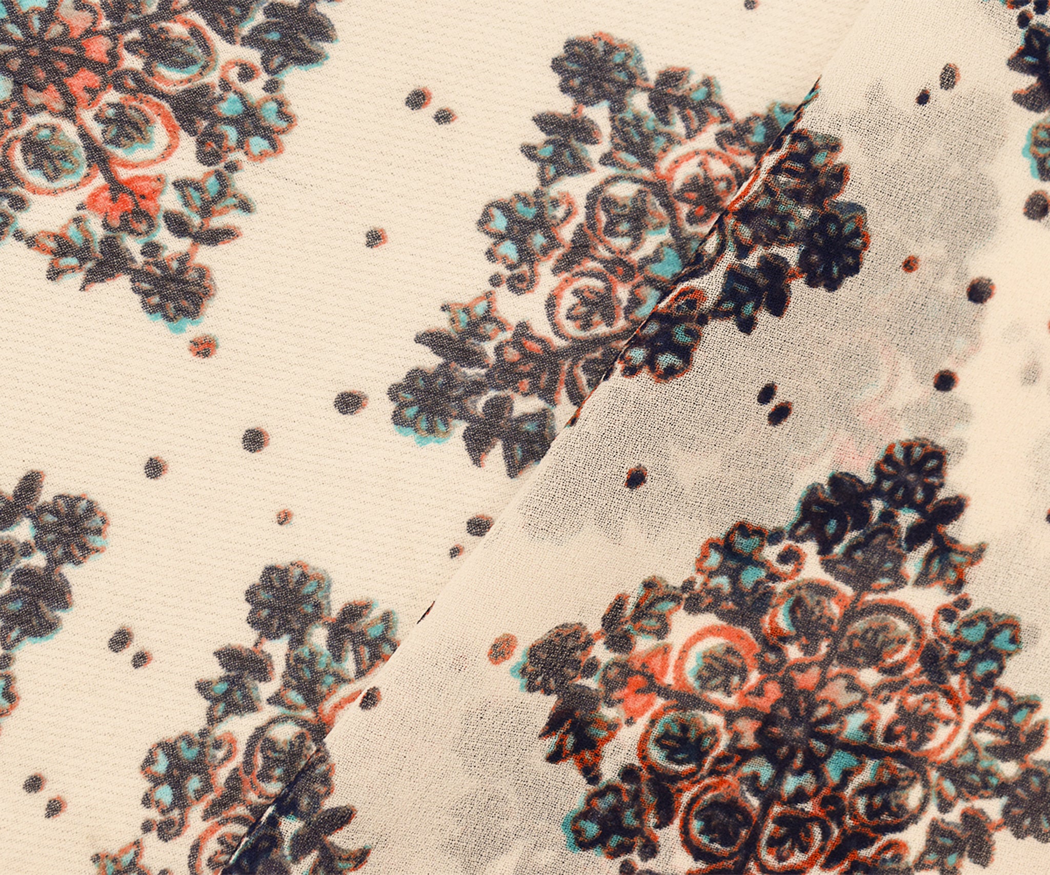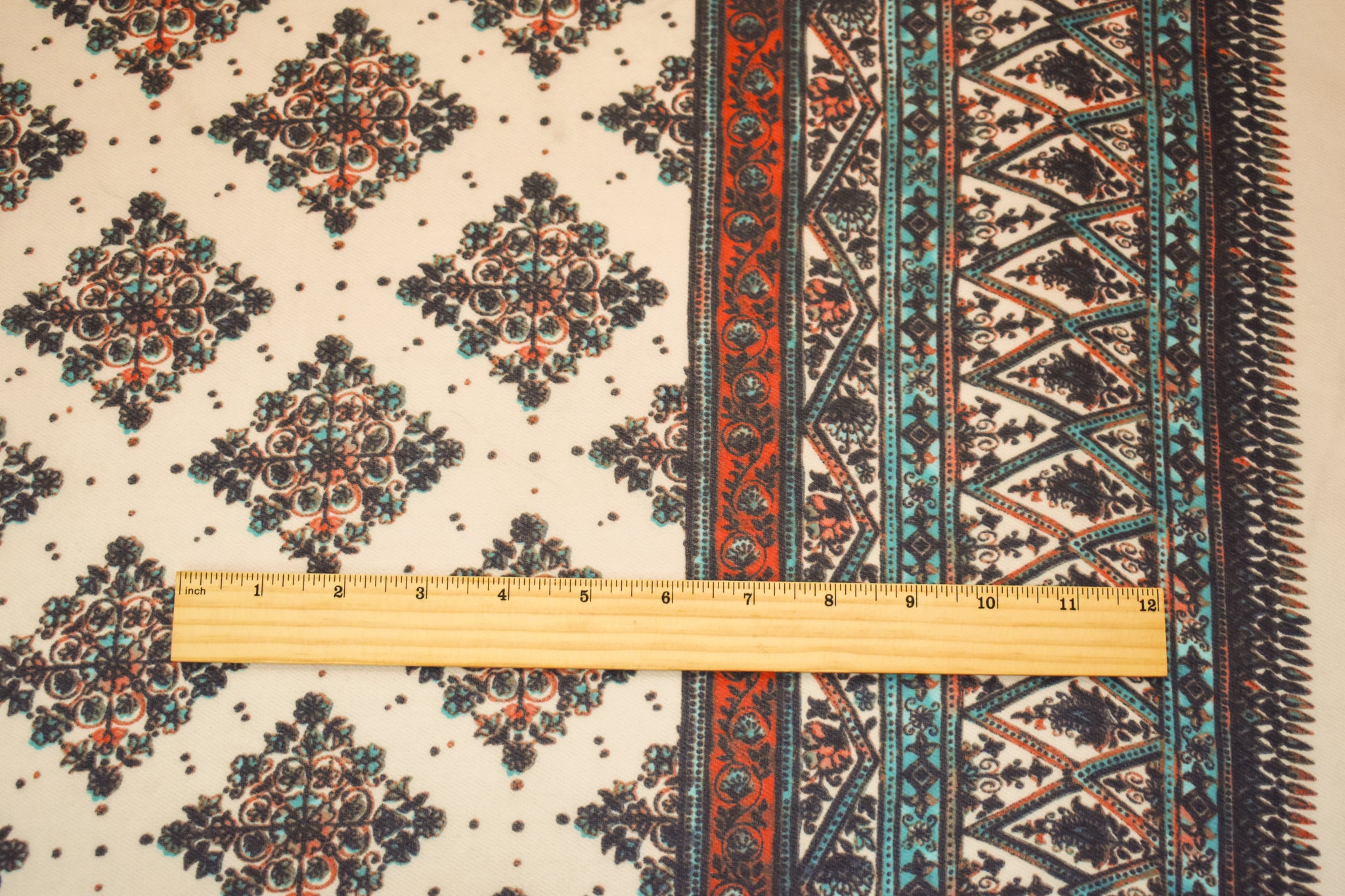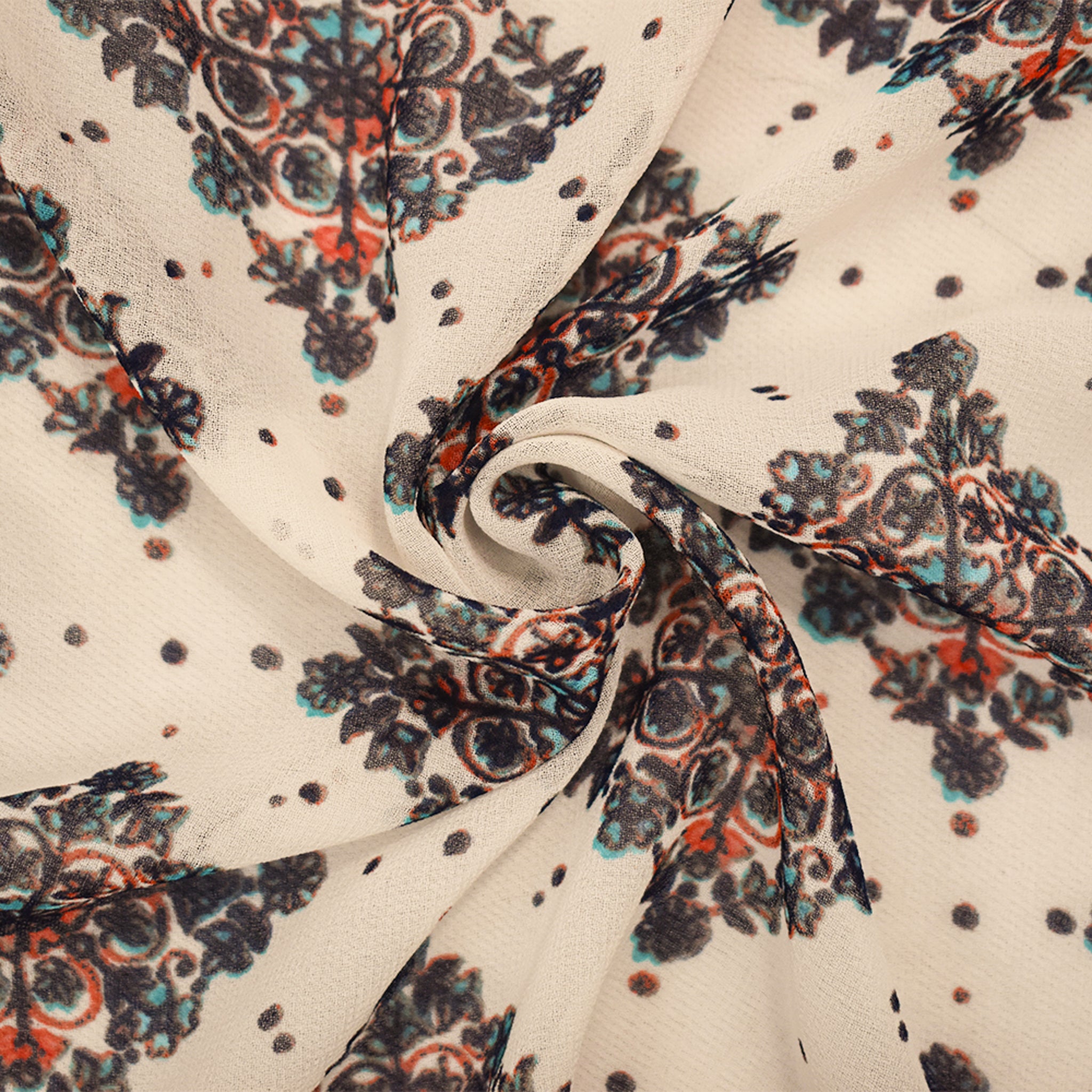 Turquoise-Coral-Multi Poly Bordered Crest Printed Chiffon Woven Fabric