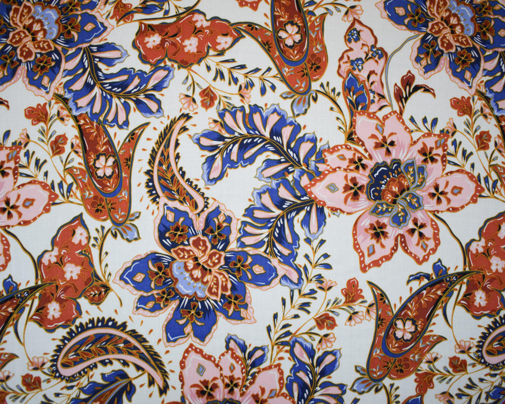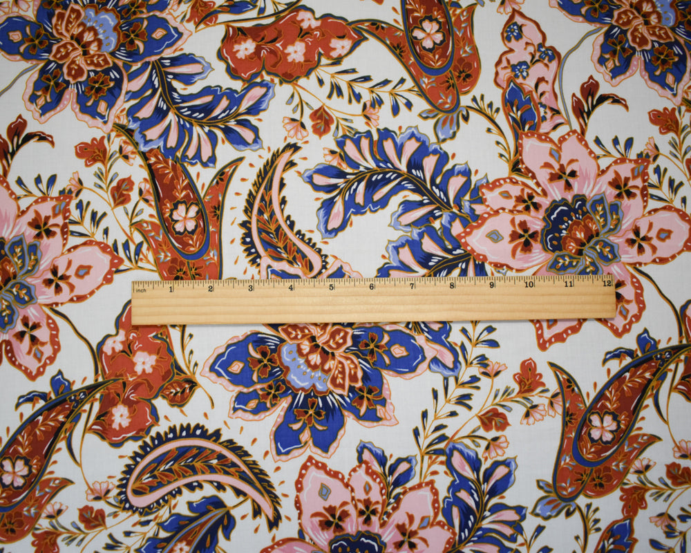 Blue-Orange-Multi Cotton-Rayon Floral Printed Lawn Woven Fabric