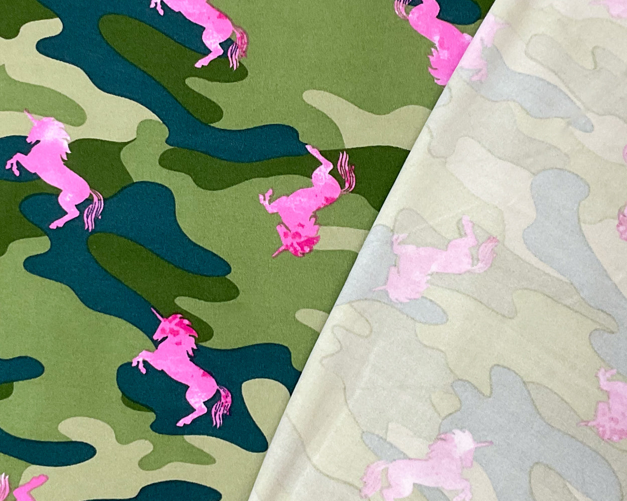 Green-Pink Poly Stretch Spandex Camo Unicorn Print DB Jersey Knit Fabric