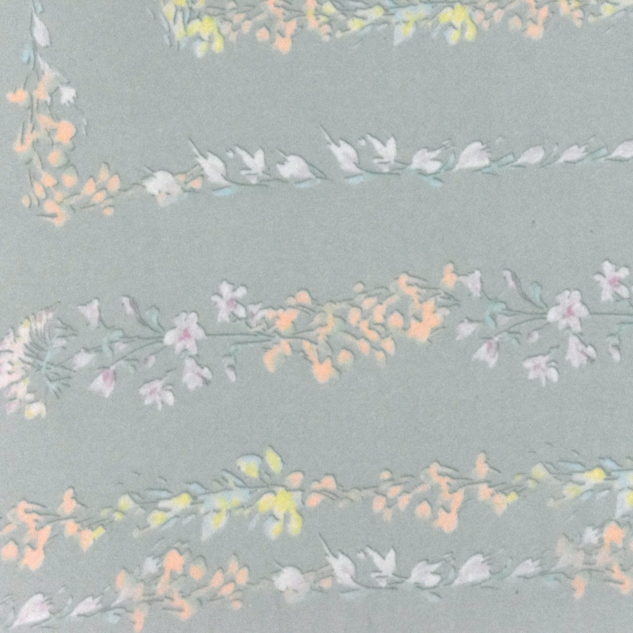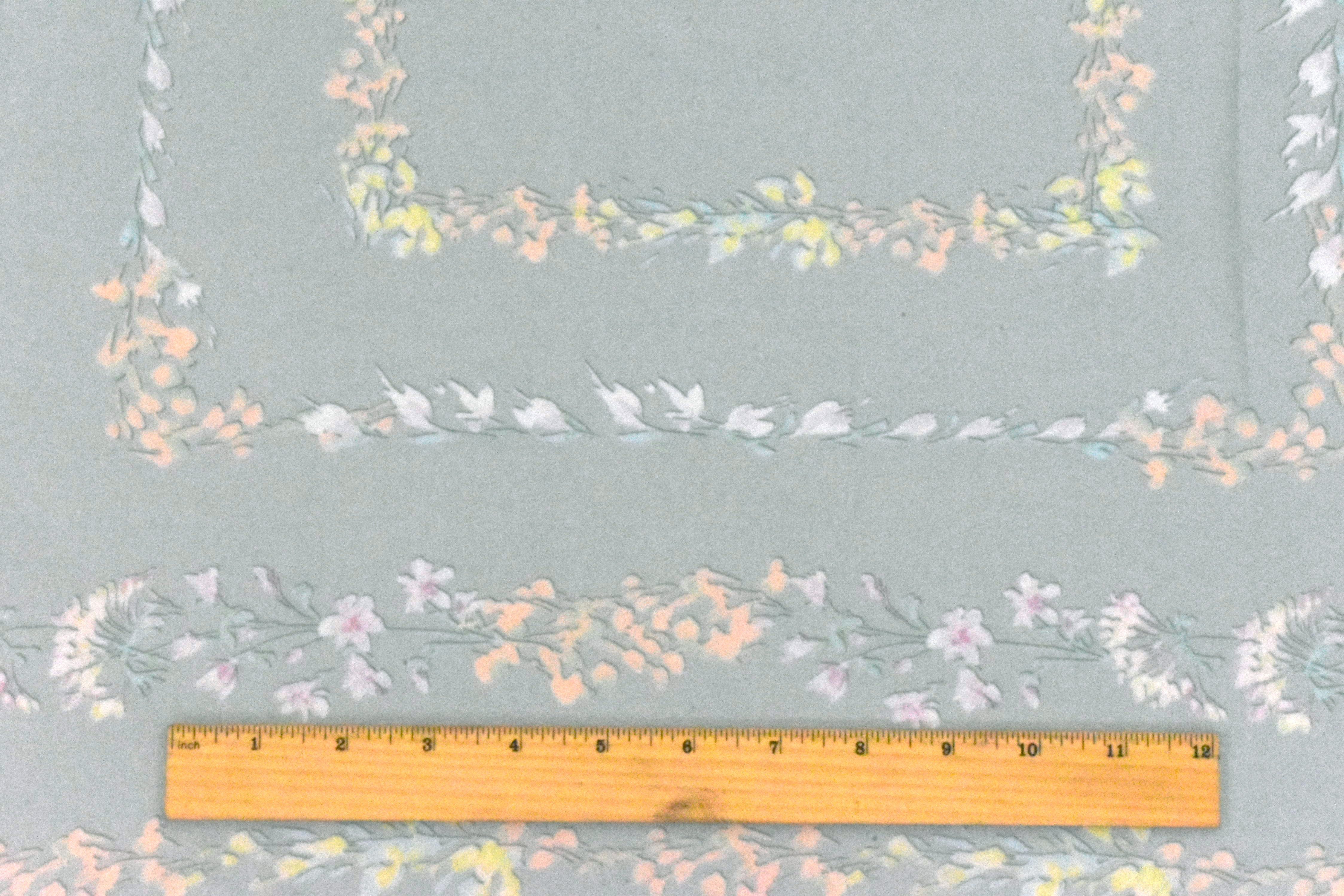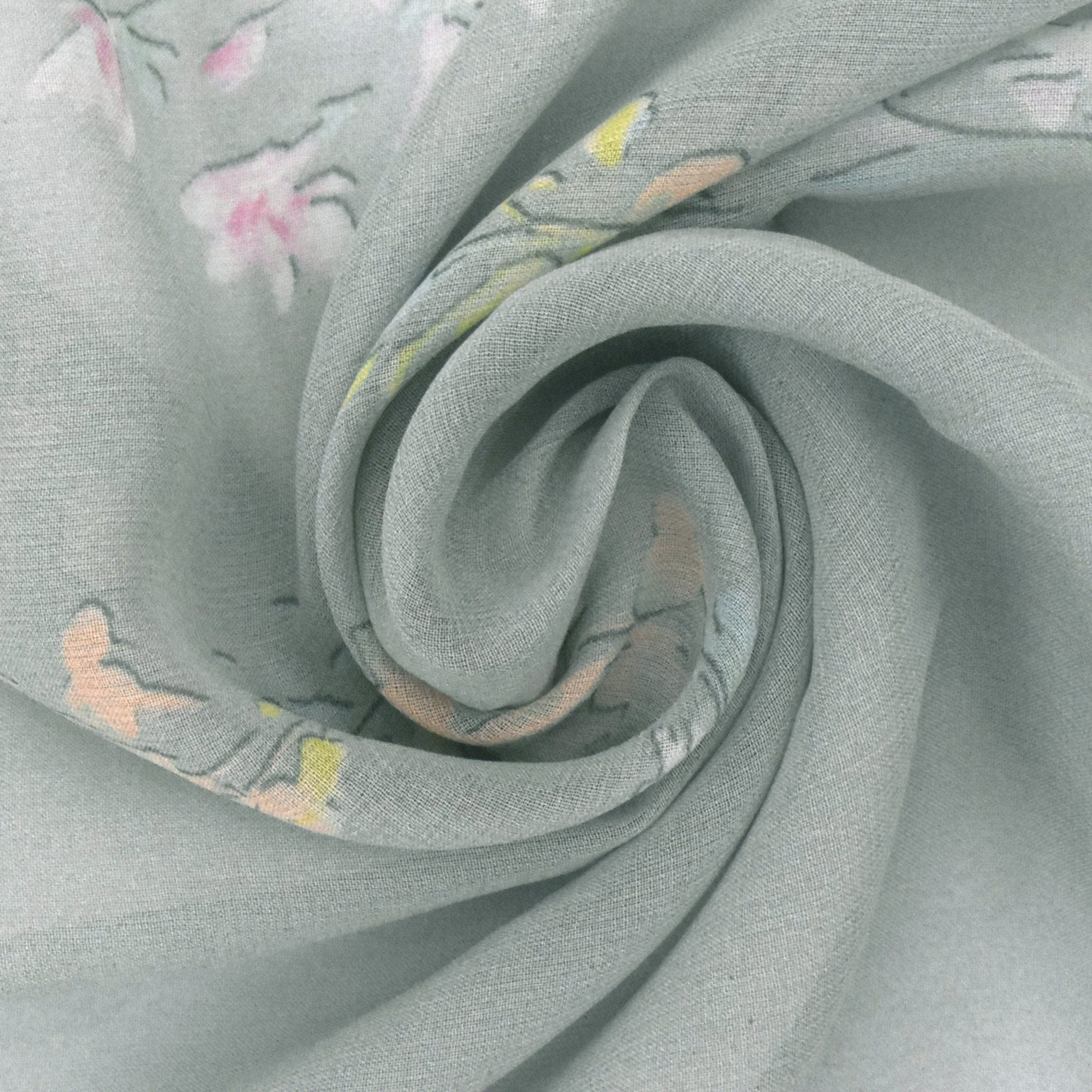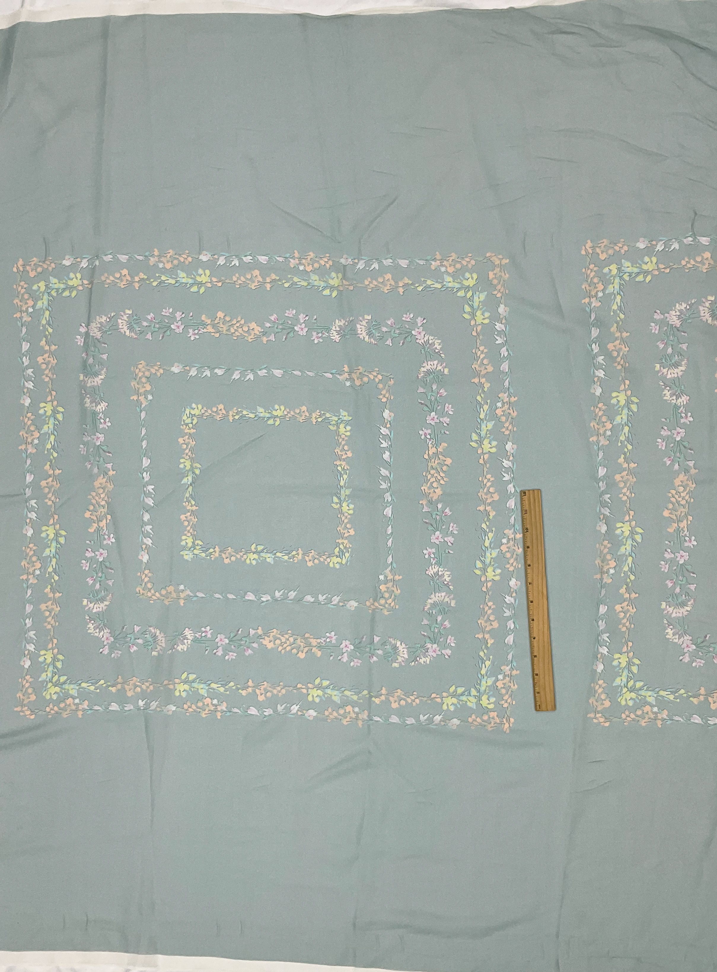 -100% silk chiffon fabric with a floral frame-like border print, ideal for scarves or overlays. Please note: This fabric is sold by panel. One piece will have an approx. 30" x 51" fabric with an approx. 26" x 28" printed pattern.