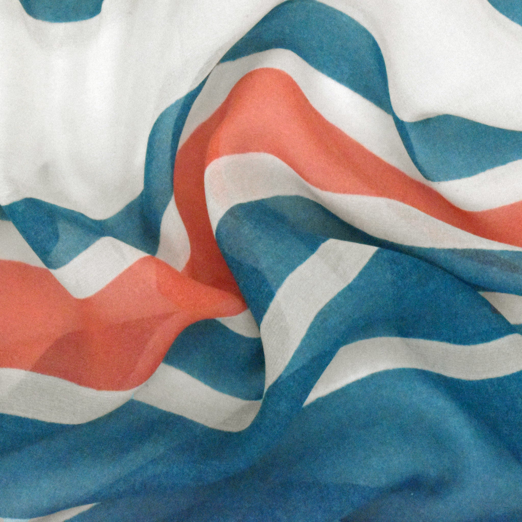 Ocean Teal-Red-Ivory Stripe Printed Silk Chiffon Fabric