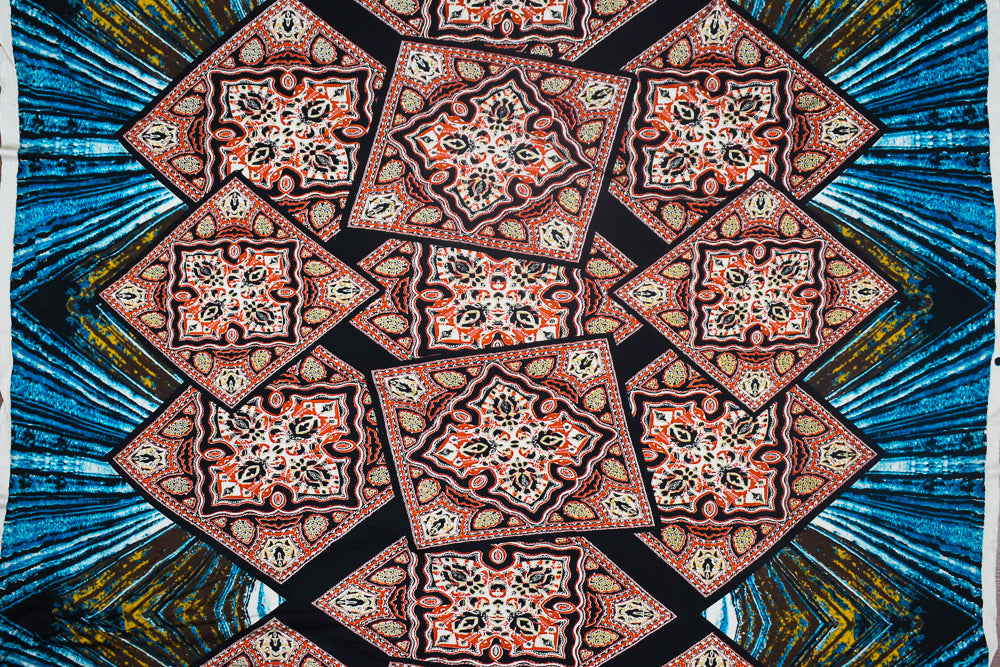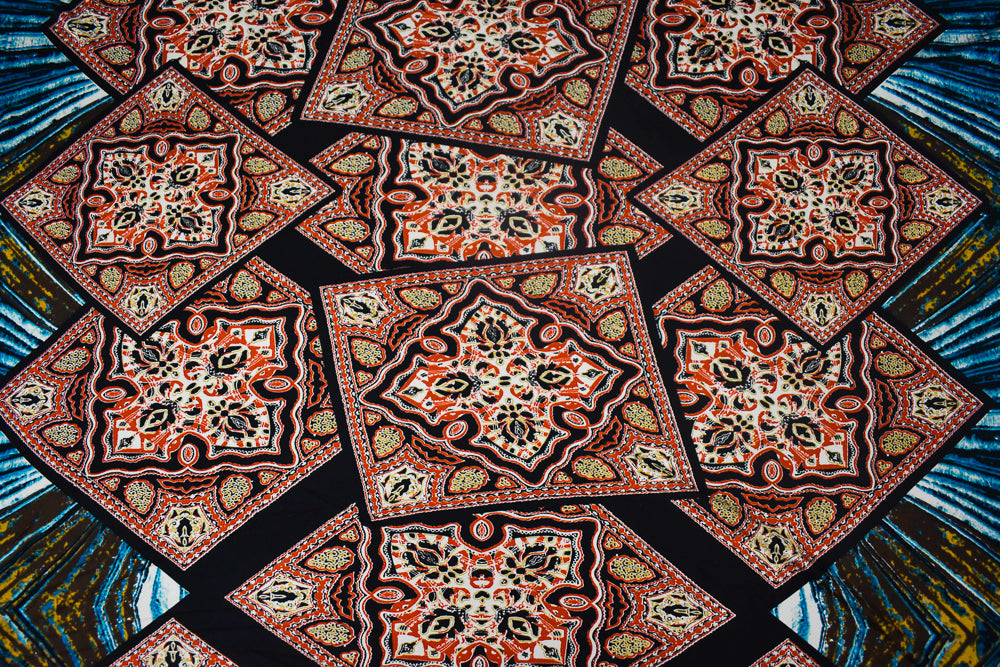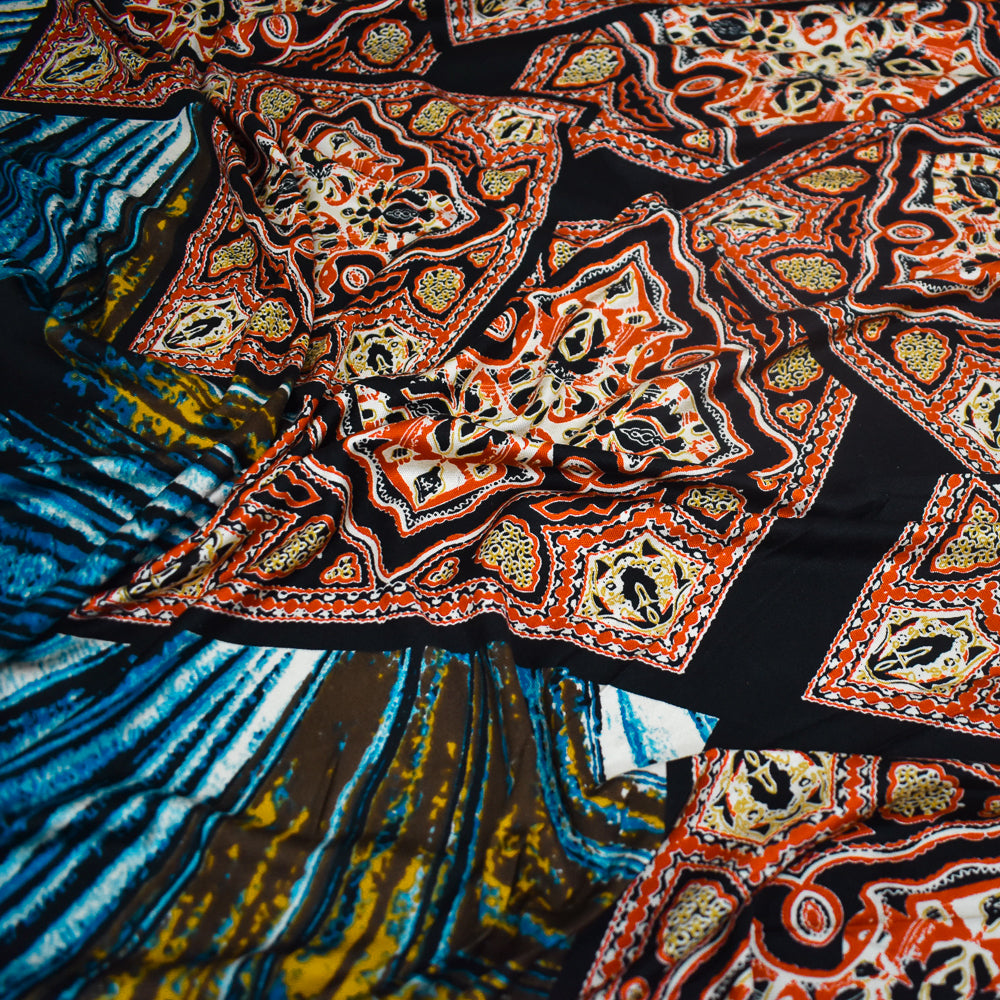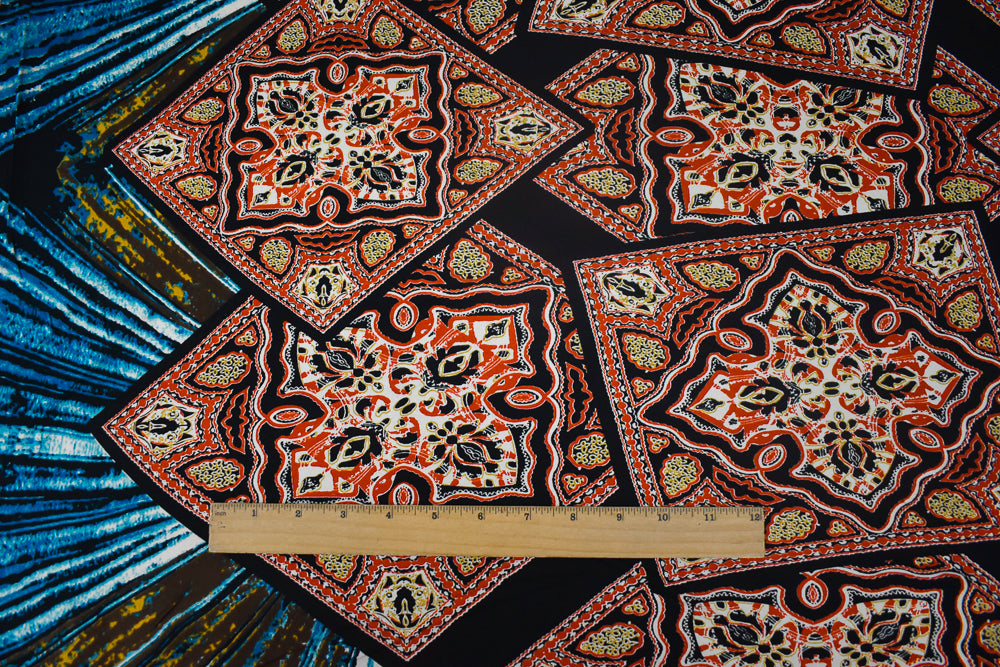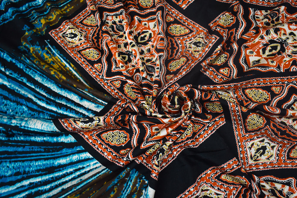 Blue-Orange-Multi Tie Dye Aztec Printed Stretch Silk Jersey Knit Fabric