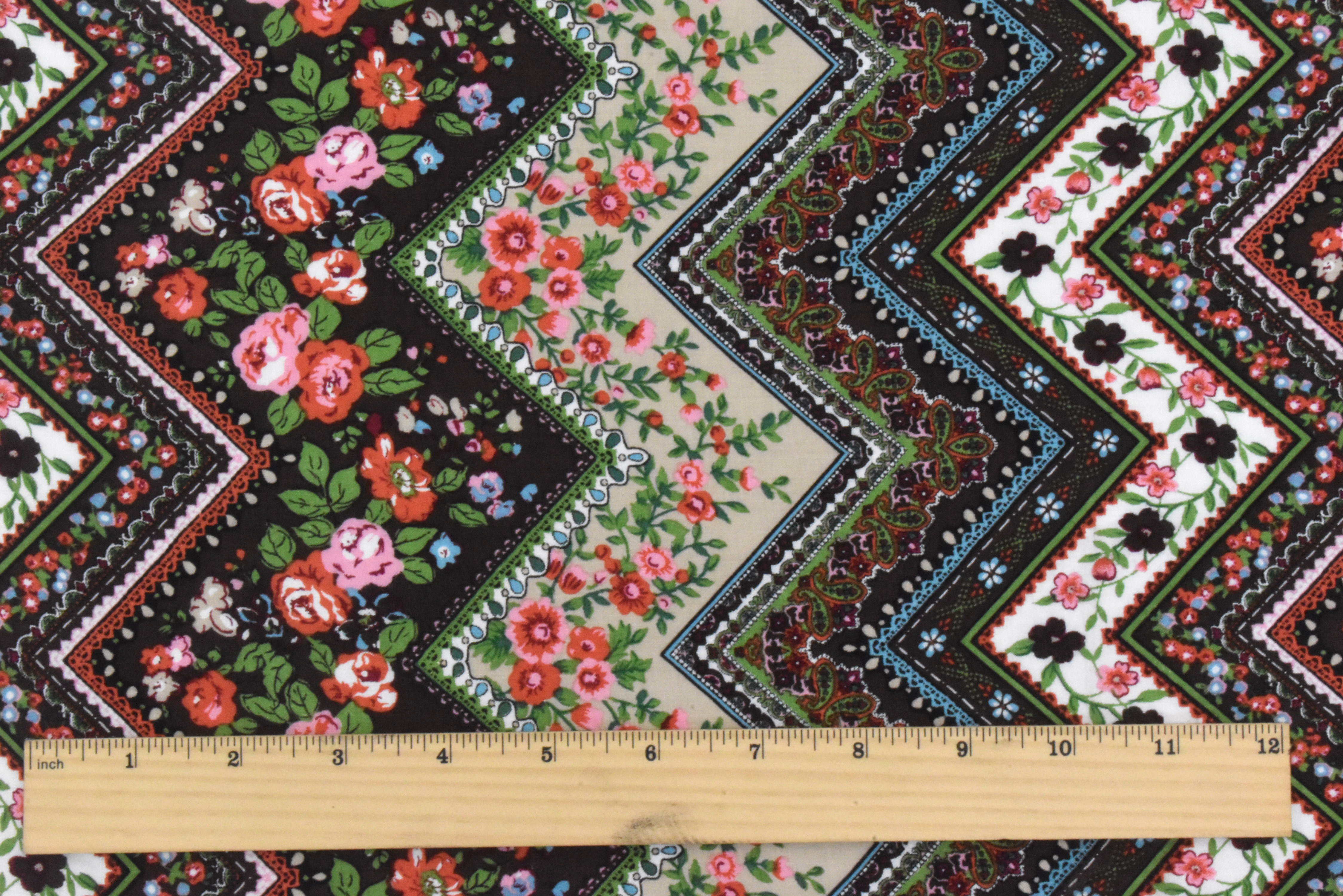 Brown-Green-Multi Chevron Floral Printed Woven Fabric