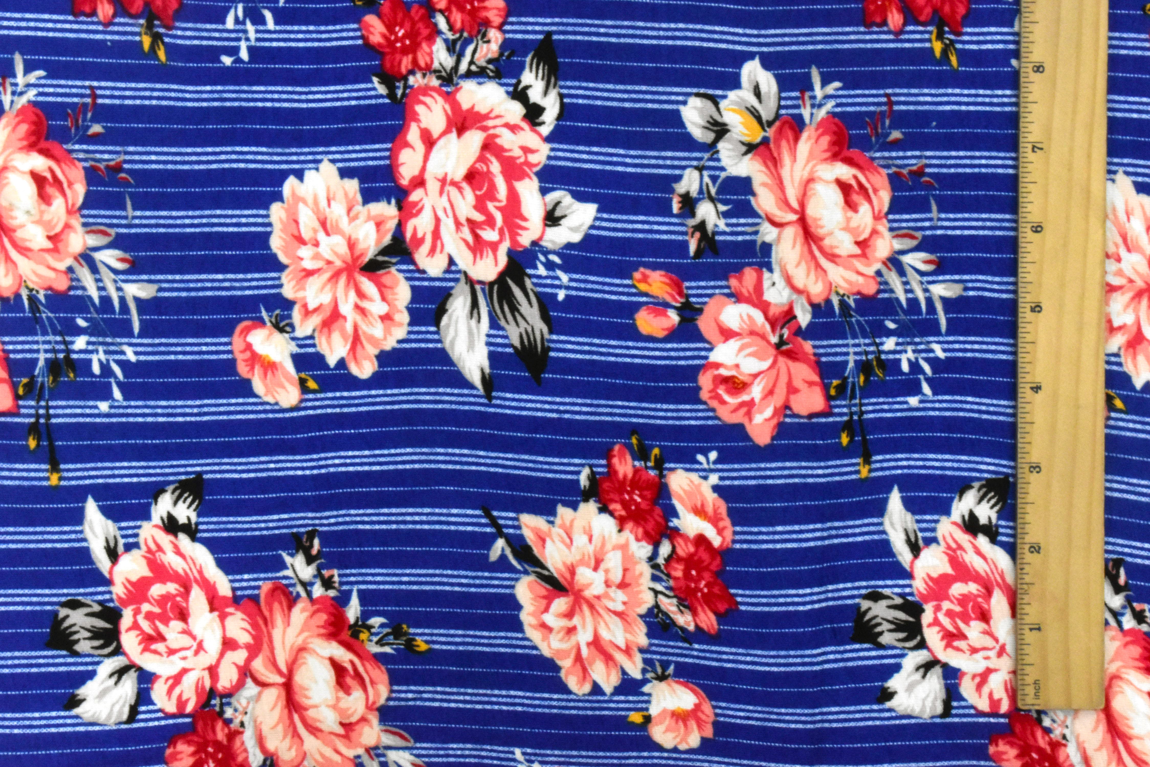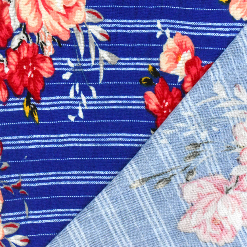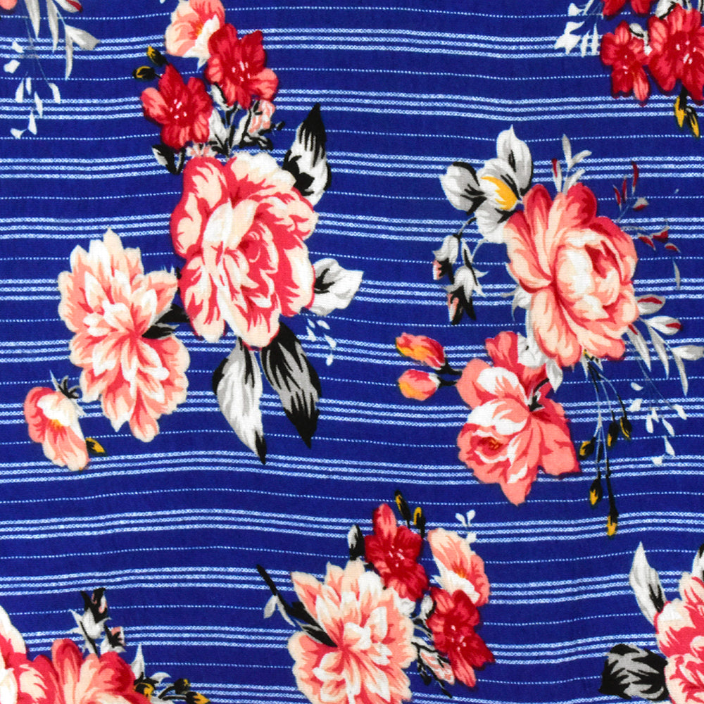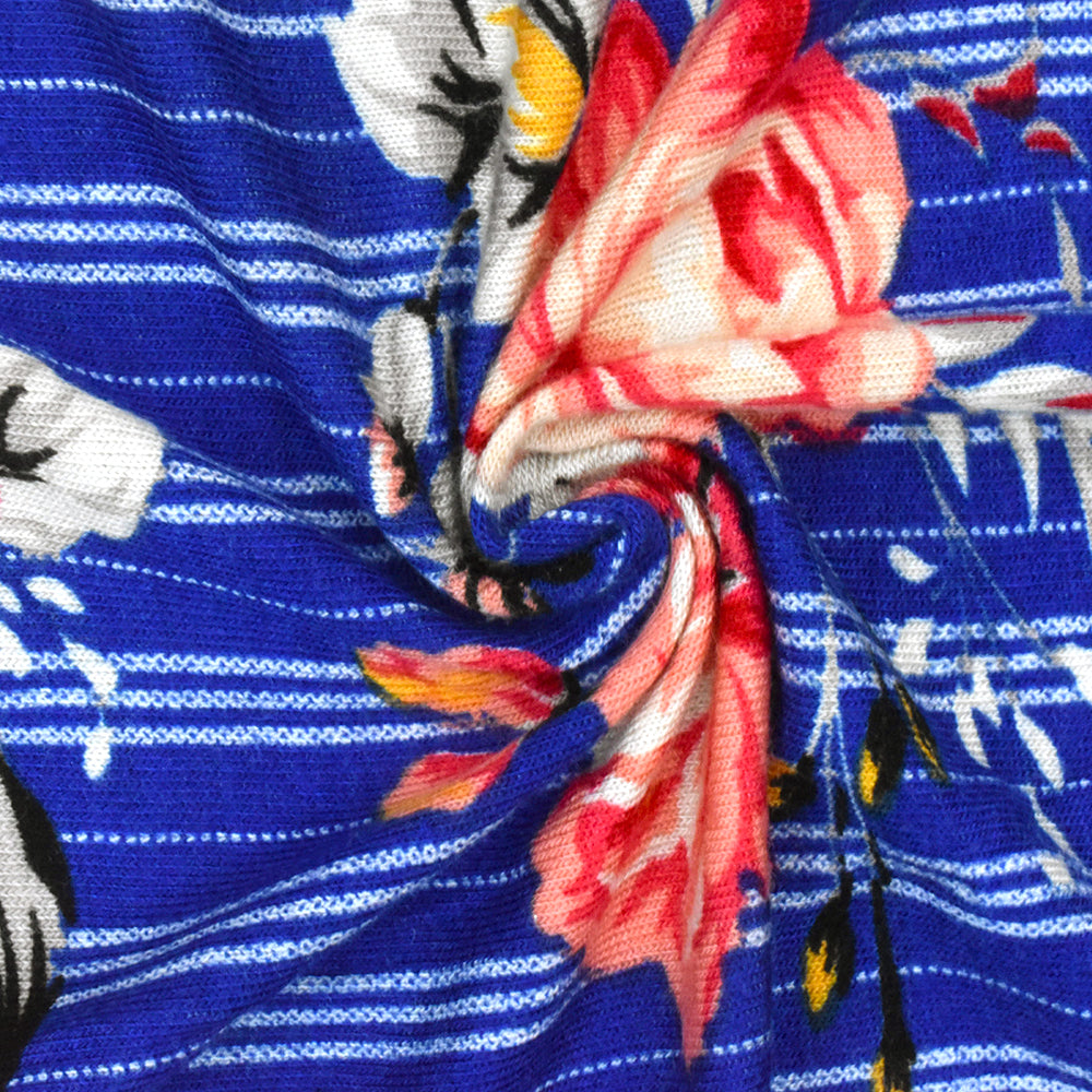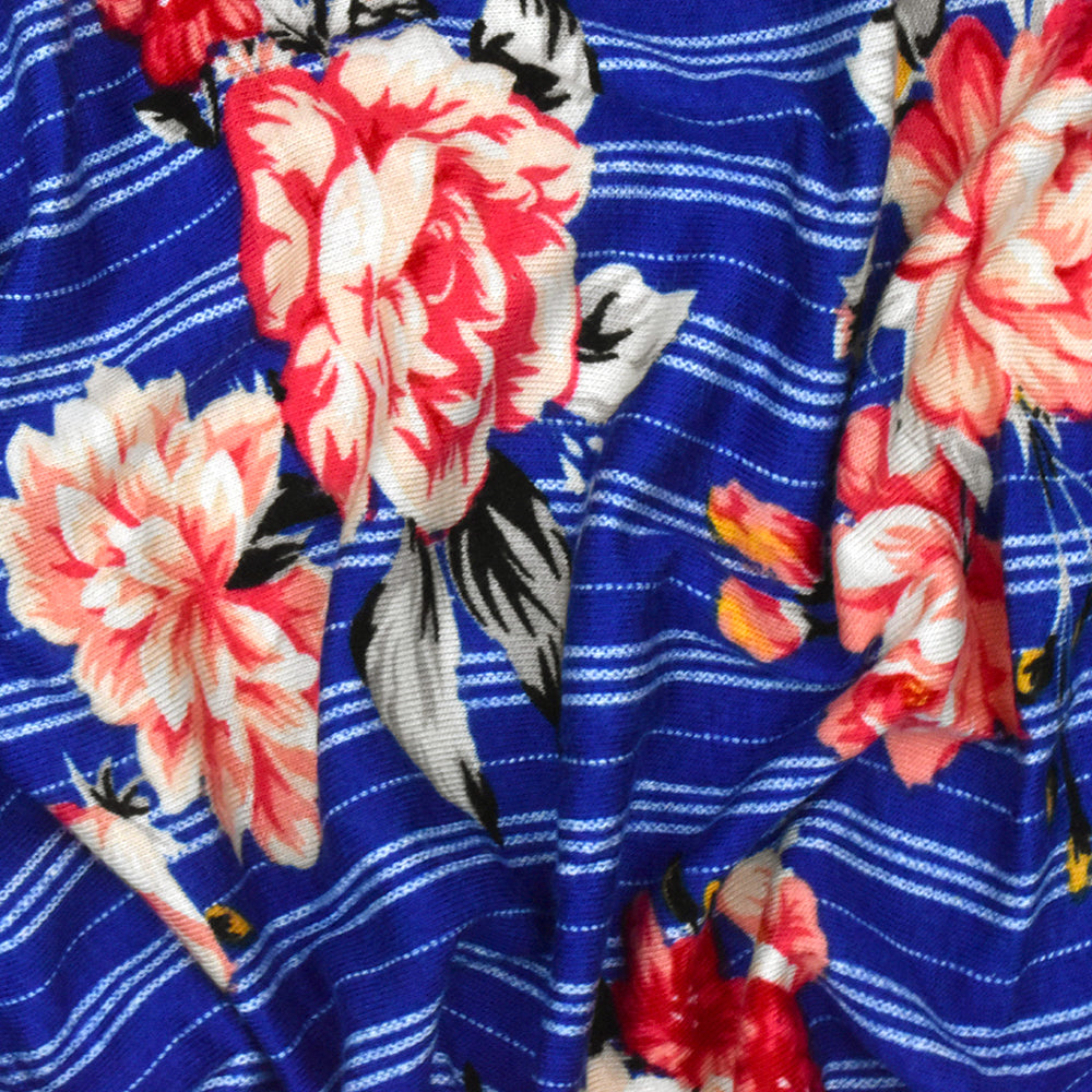 Classic Blue-Red-Multi Floral Stripe Print Rayon Stretch Jersey Knit Fabric