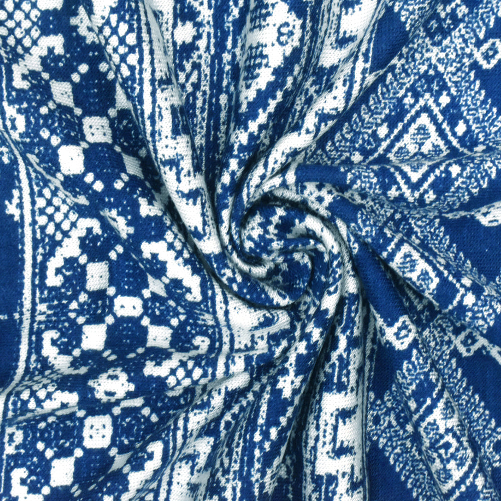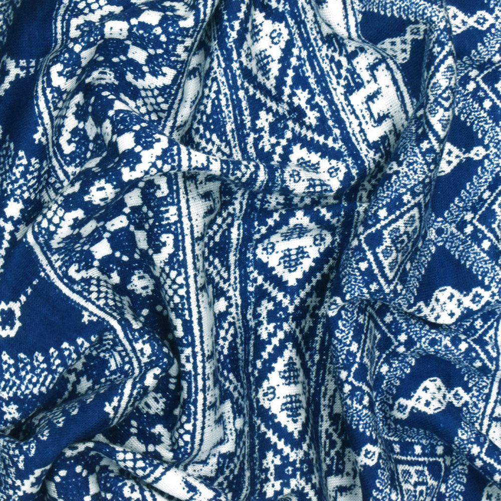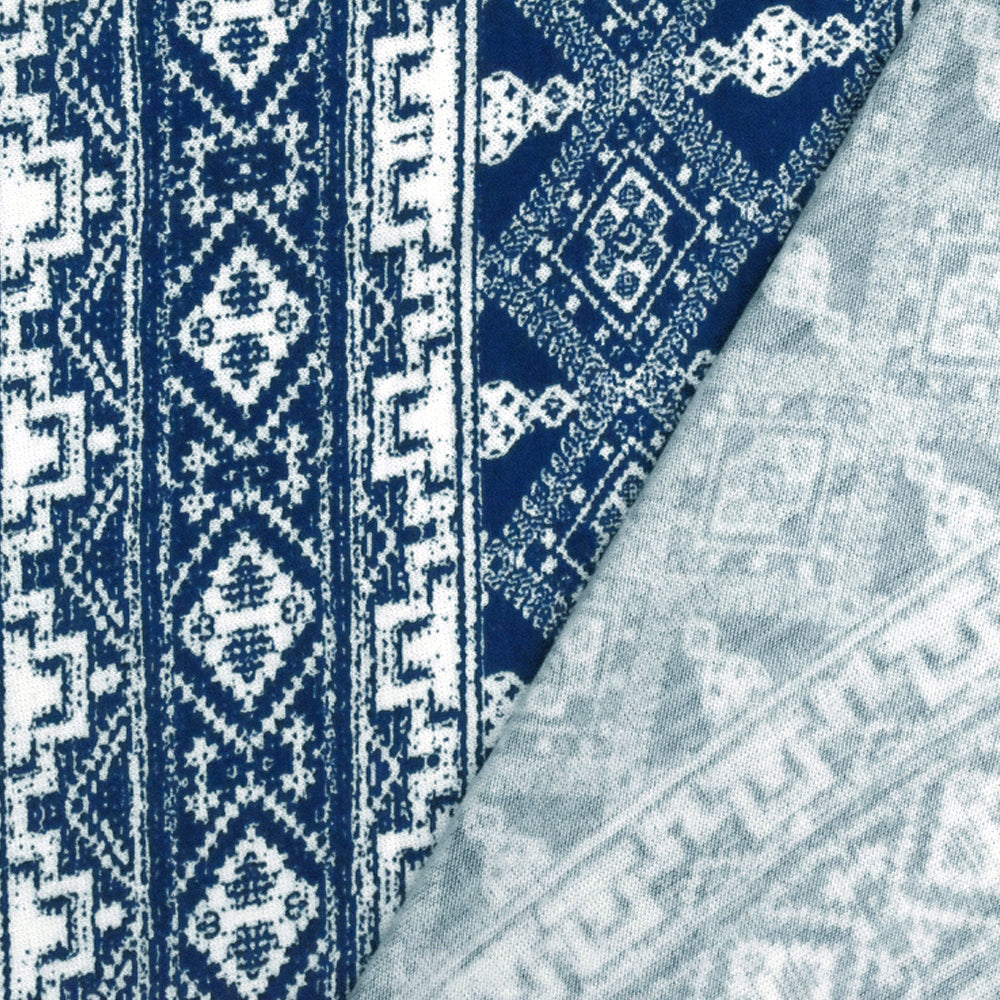 Ink Blue-White Aztec Printed Stretch Rayon Jersey Knit Fabric