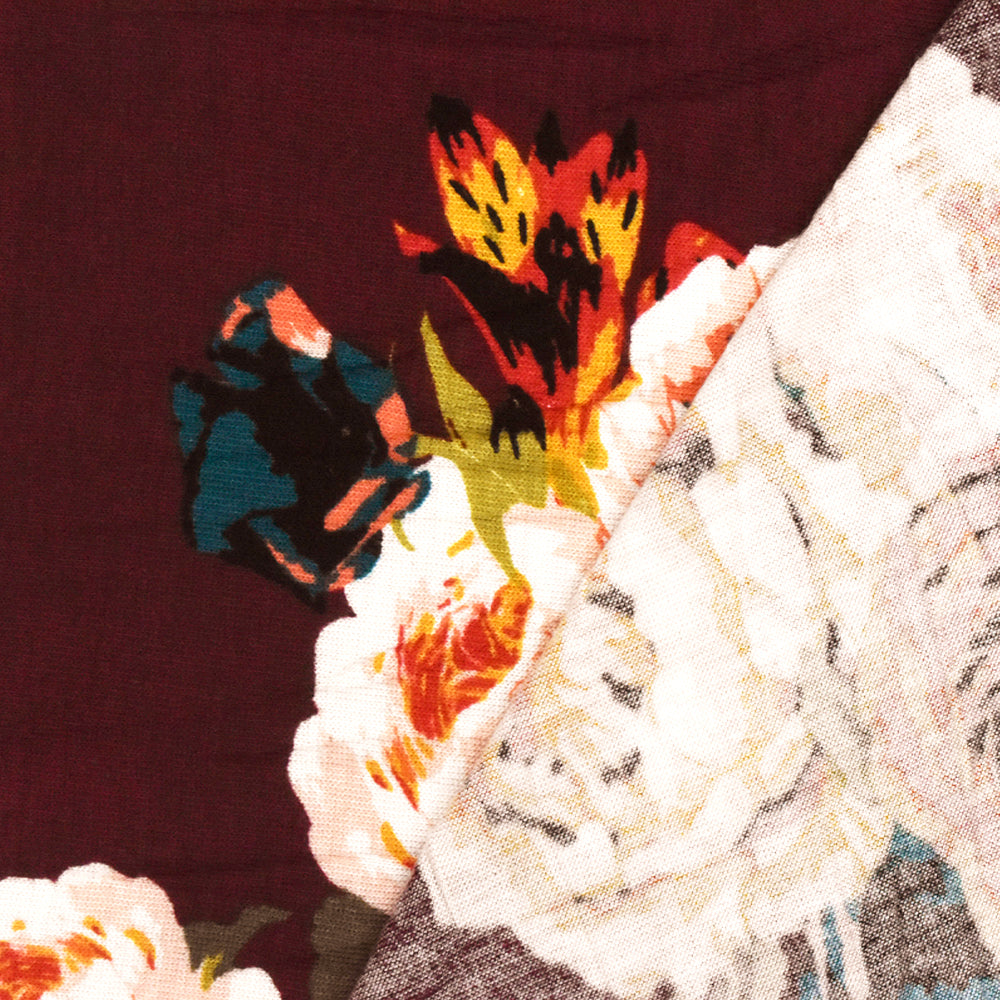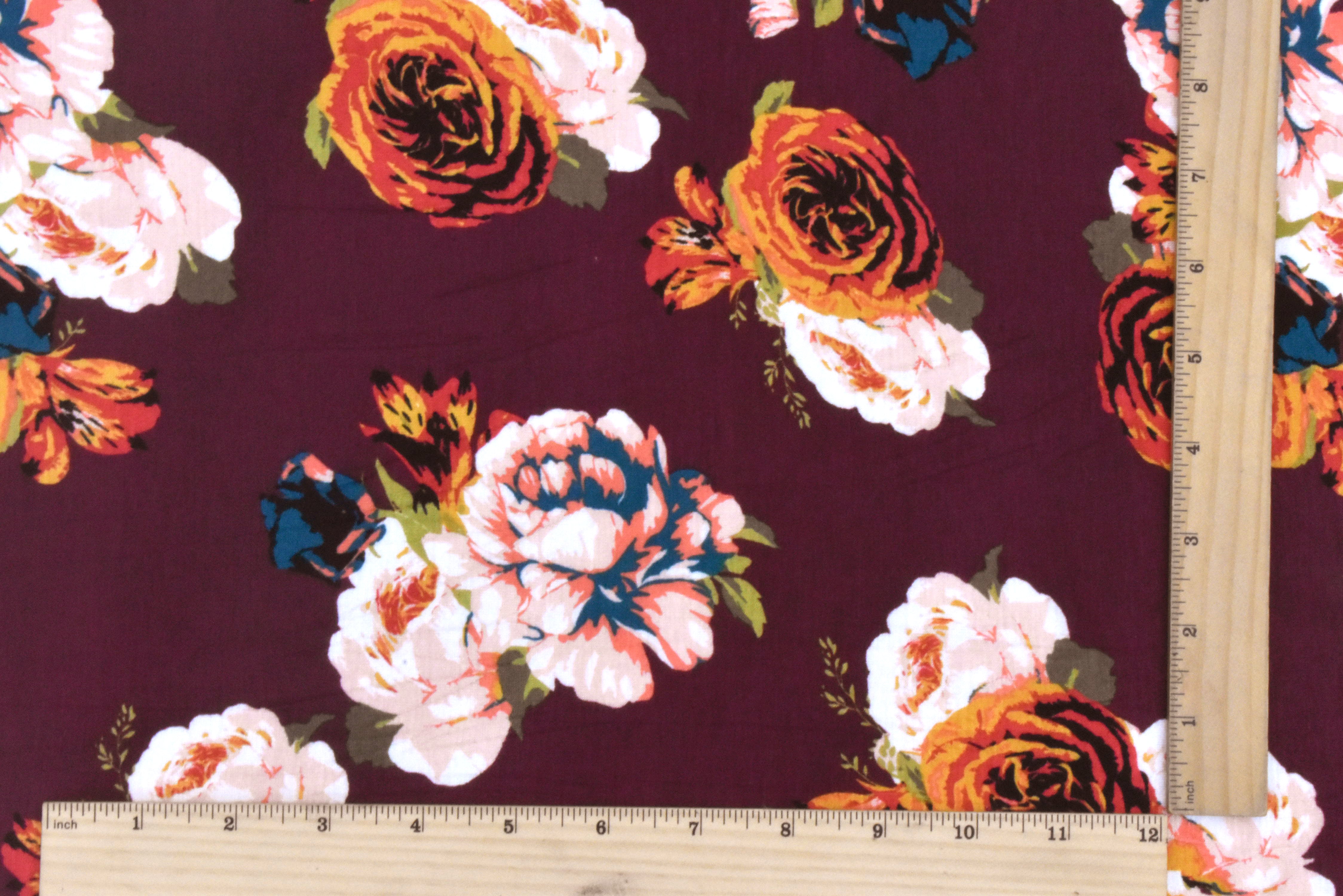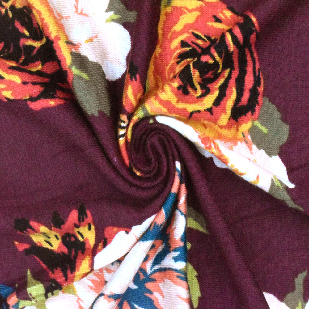 Maroon Red-Orange-Multi Floral Printed Rayon Stretch Jersey Knit Fabric