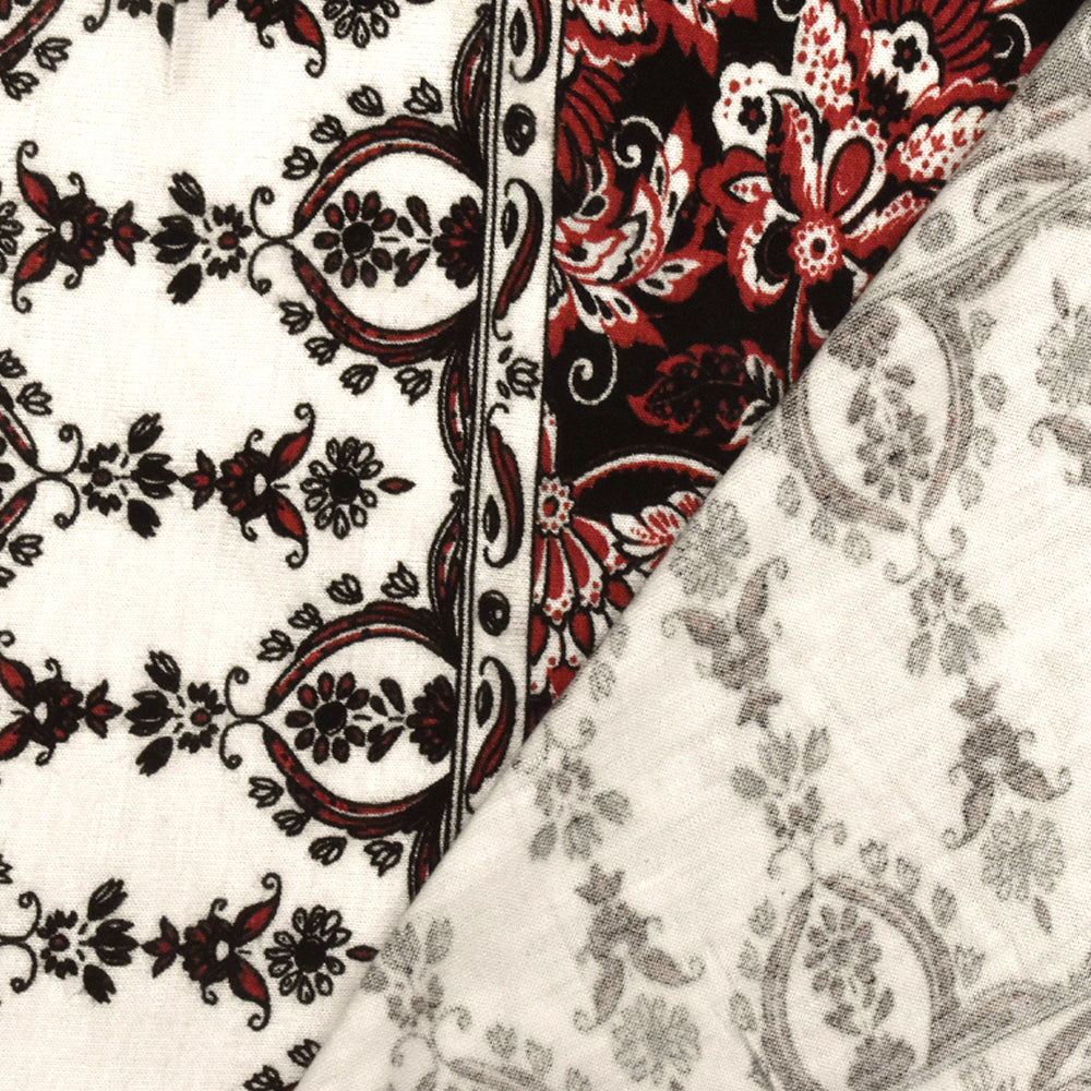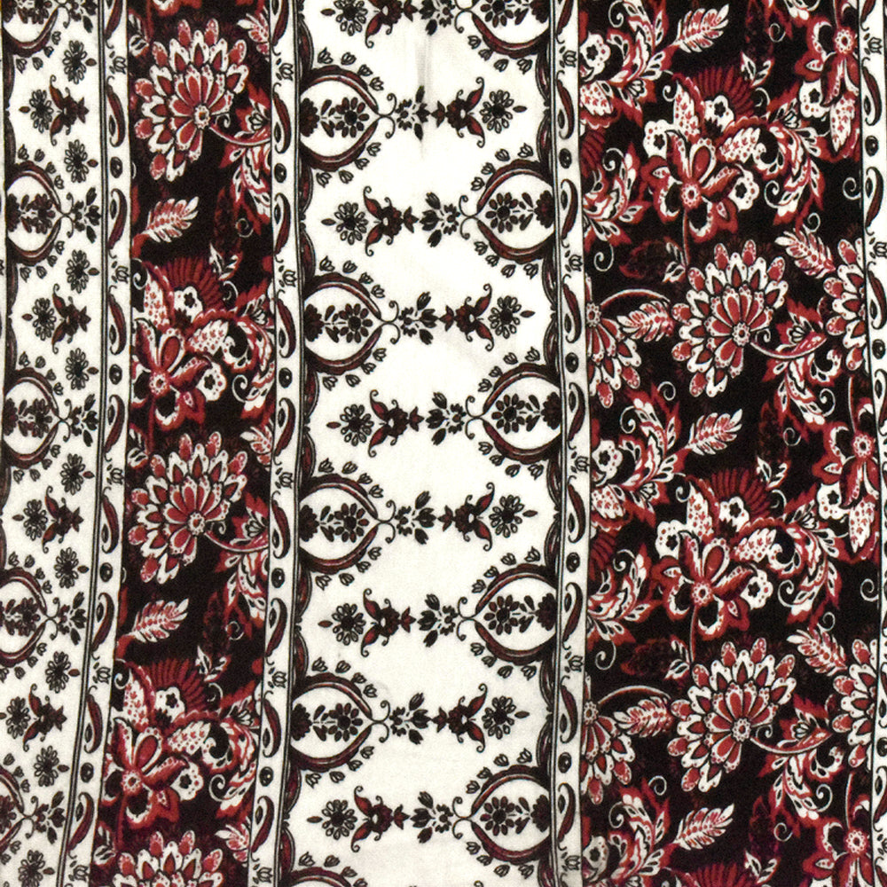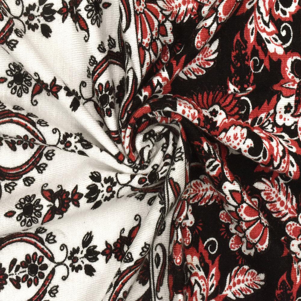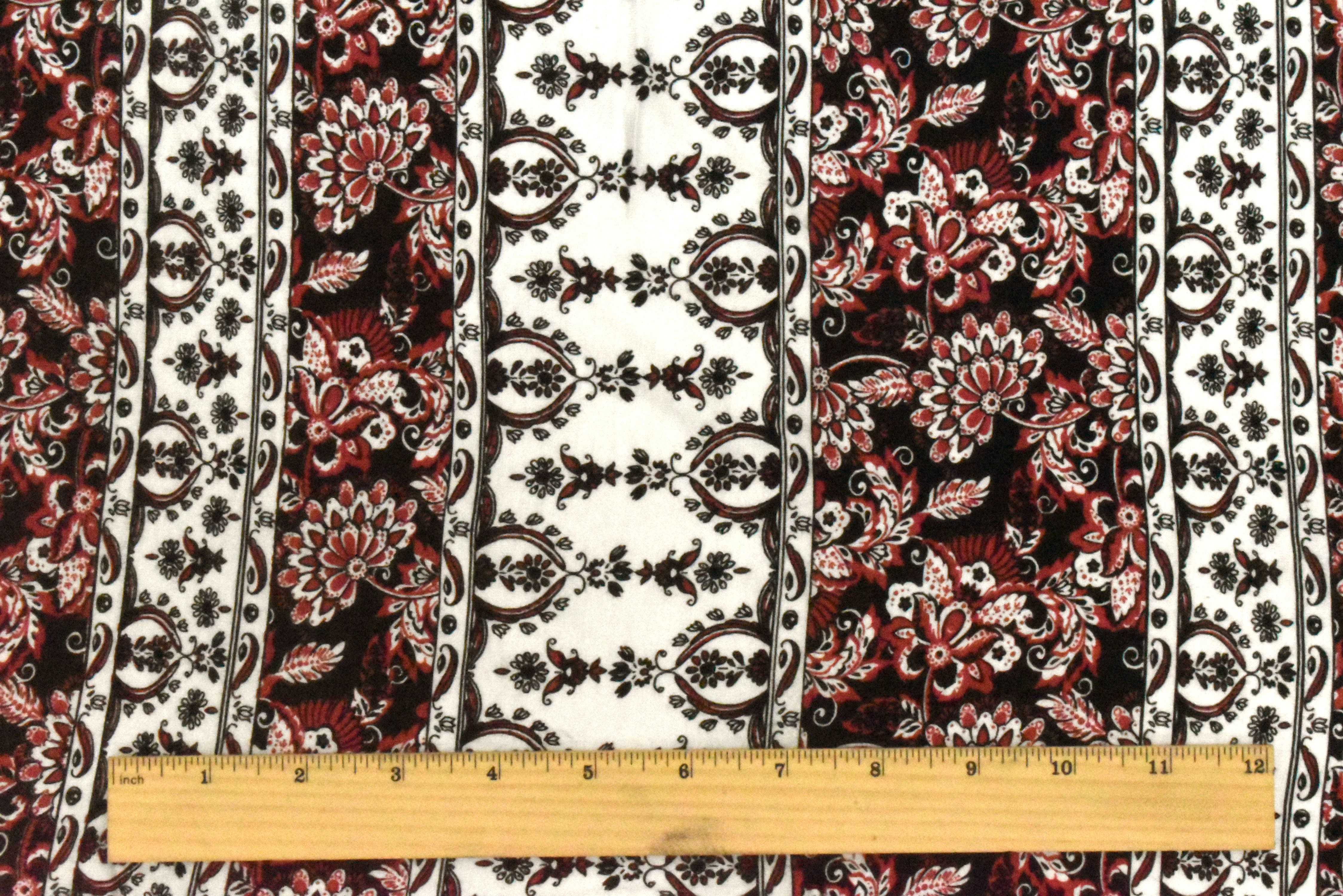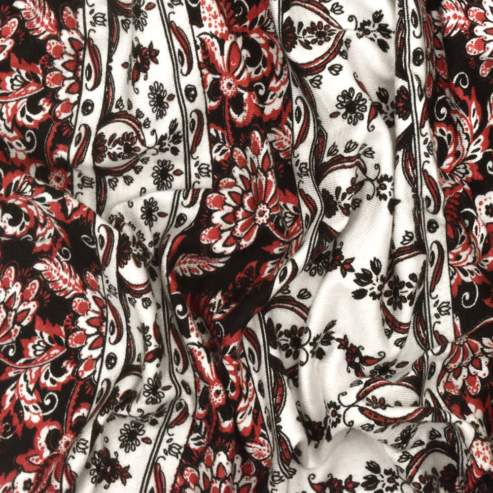 Red-Black-Ivory Stripe Floral Print Slub Rayon Stretch Jersey Knit Fabric