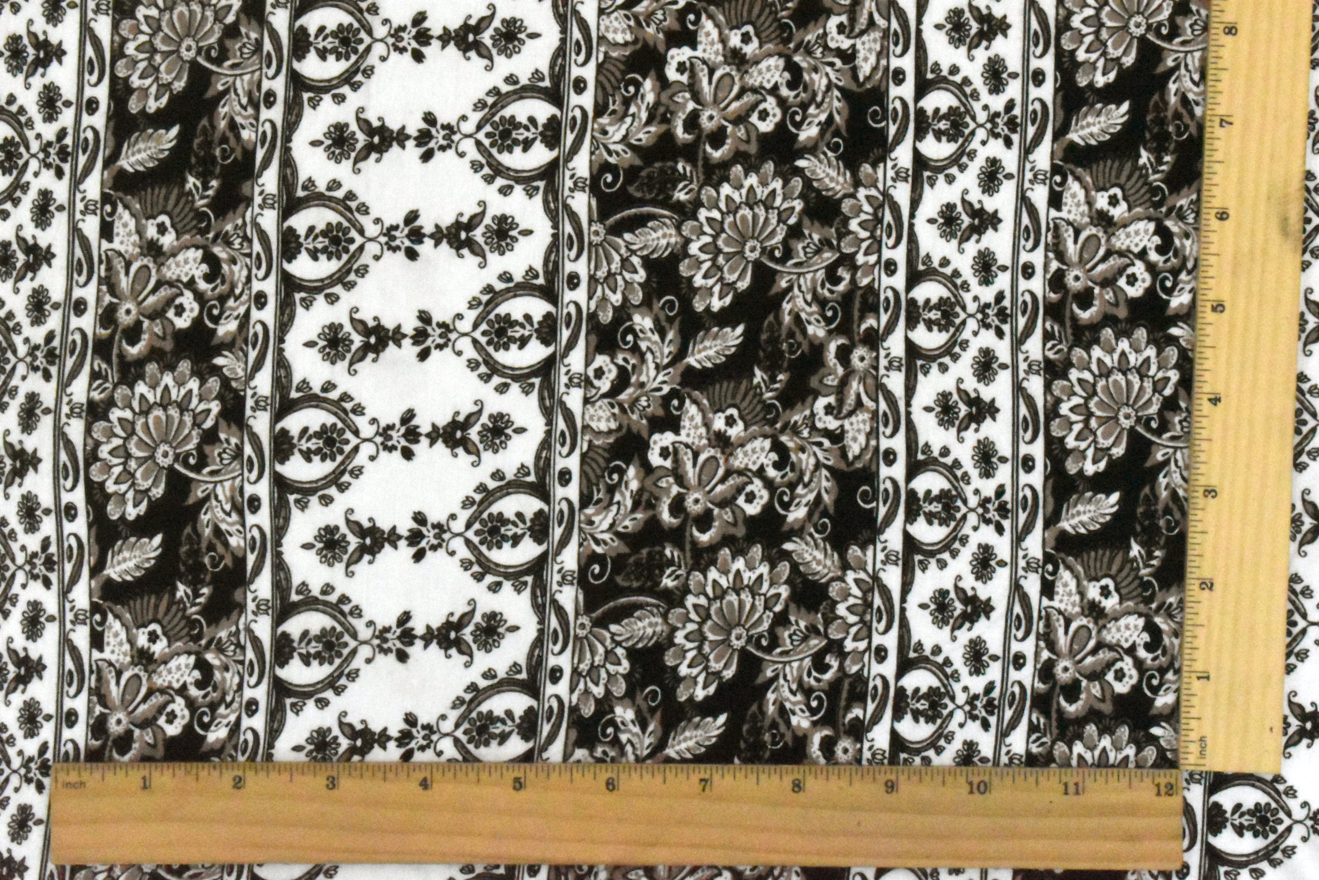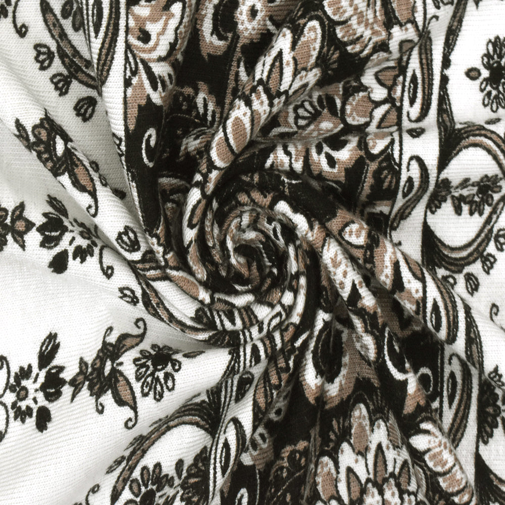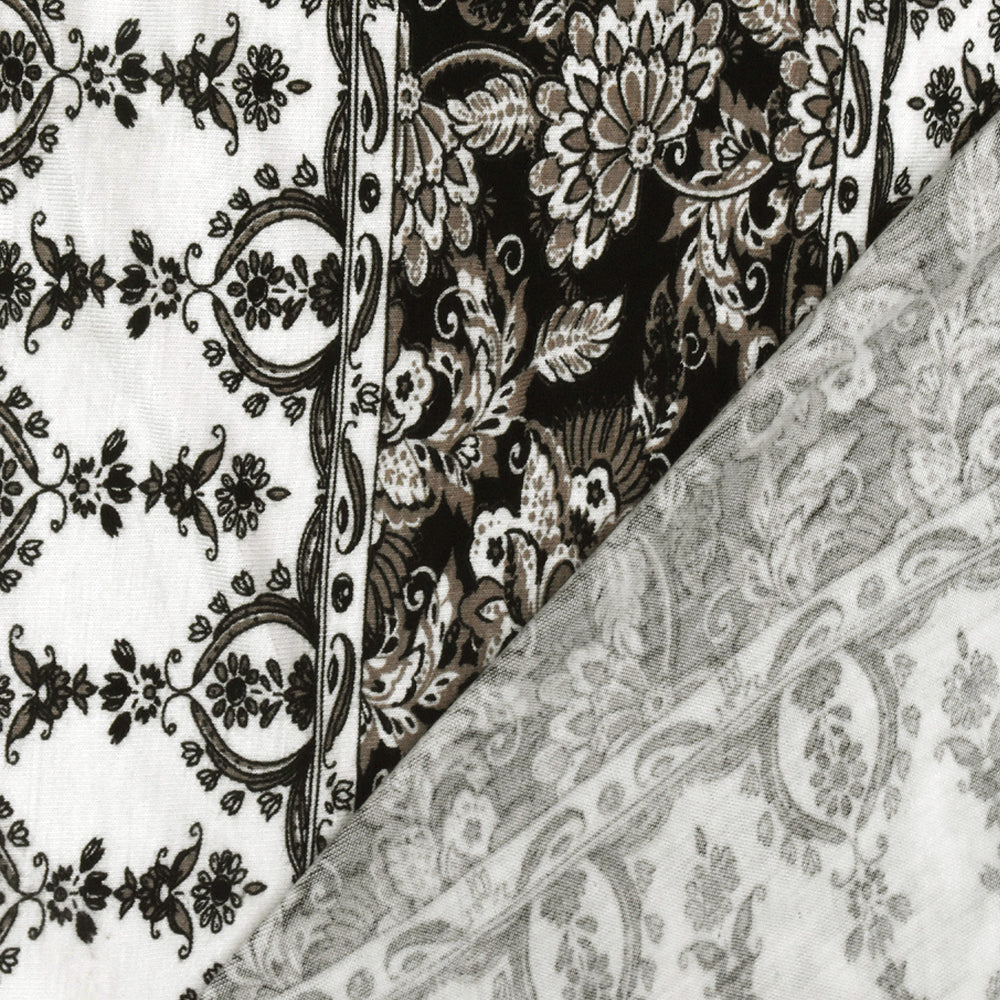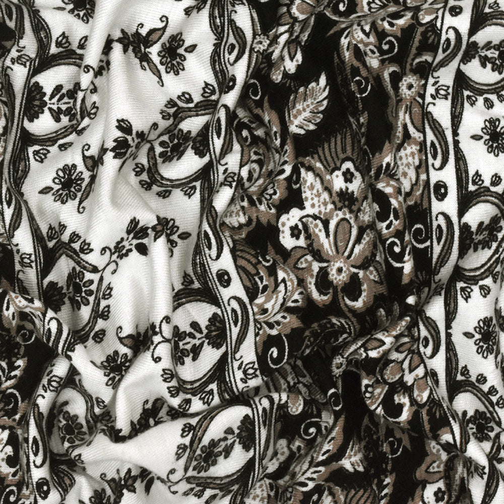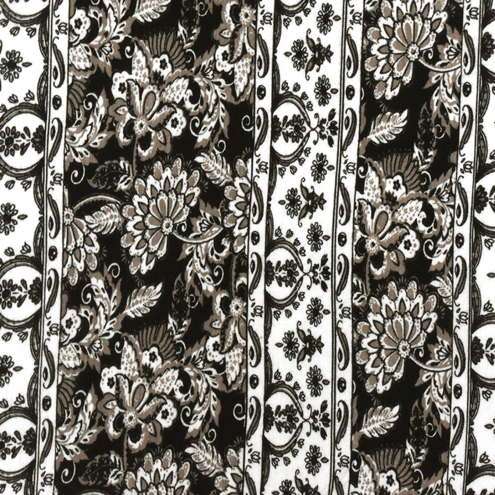 White-Taupe-Black Striped Floral Printed Rayon Stretch Jersey Knit Fabric