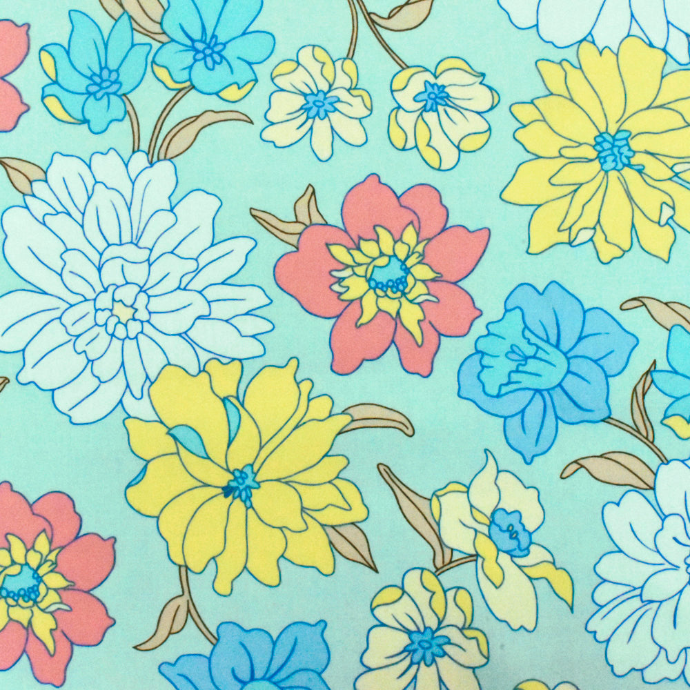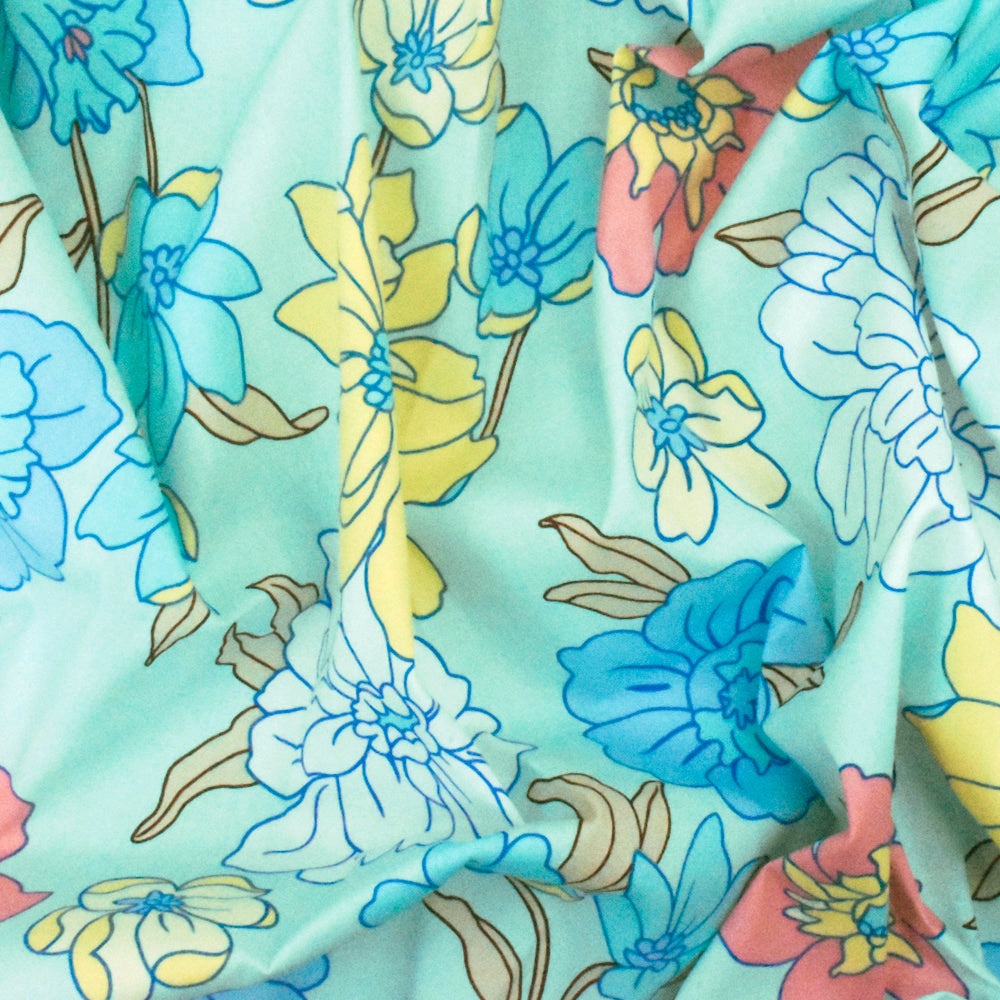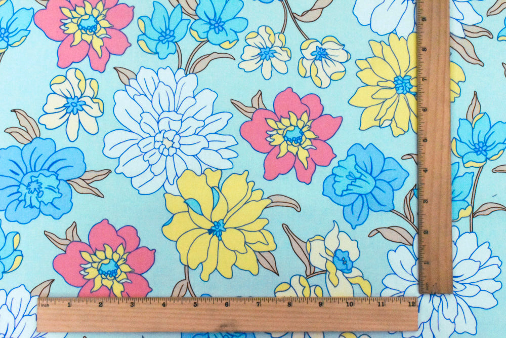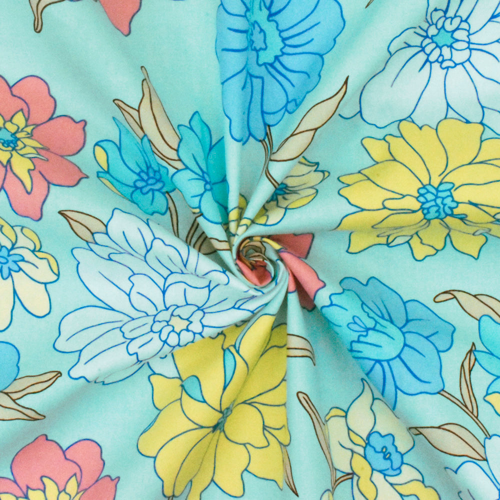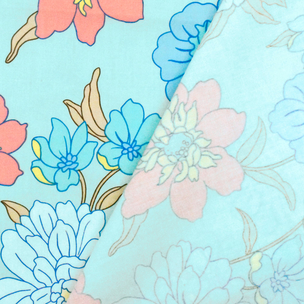Light Teal-White-Multi Floral Printed Stretch Cotton Poplin Woven Fabric