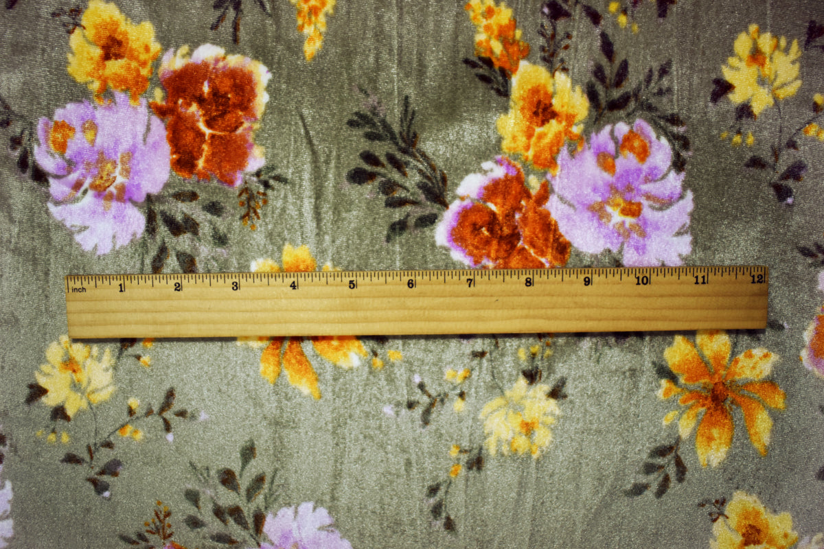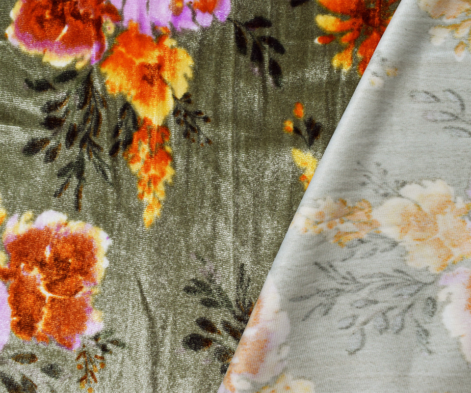 Green-Orange-Multi Poly Stretch Spandex Floral Printed Velvet Knit Fabric