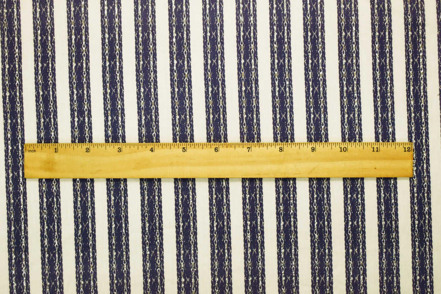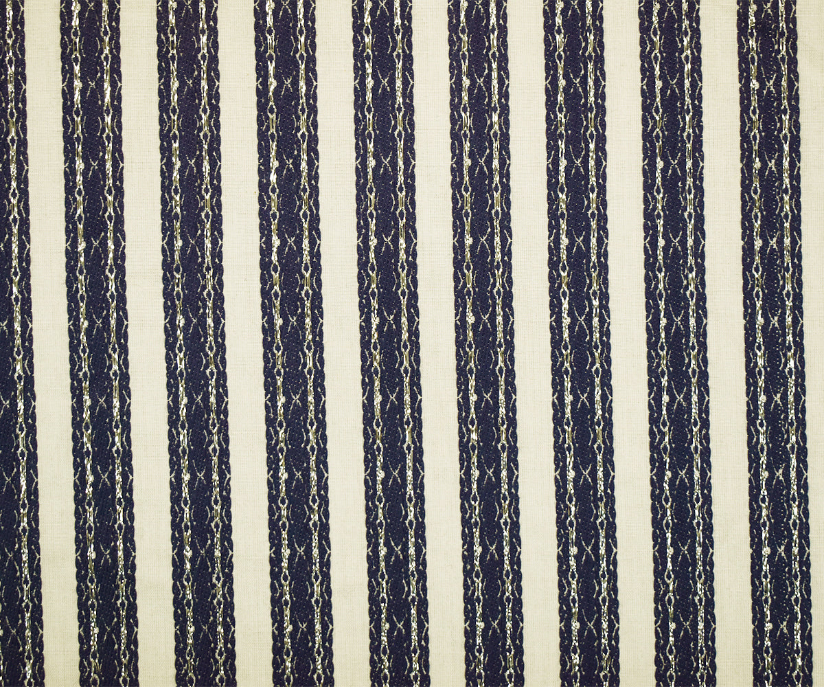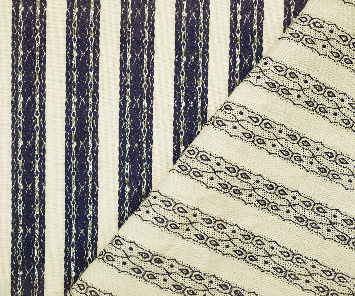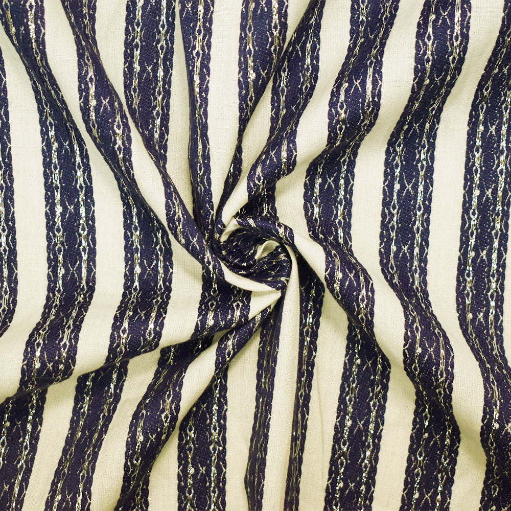 Off-White-Navy-Silver Cotton Blend Decorative Stripe Jacquard Woven Fabric