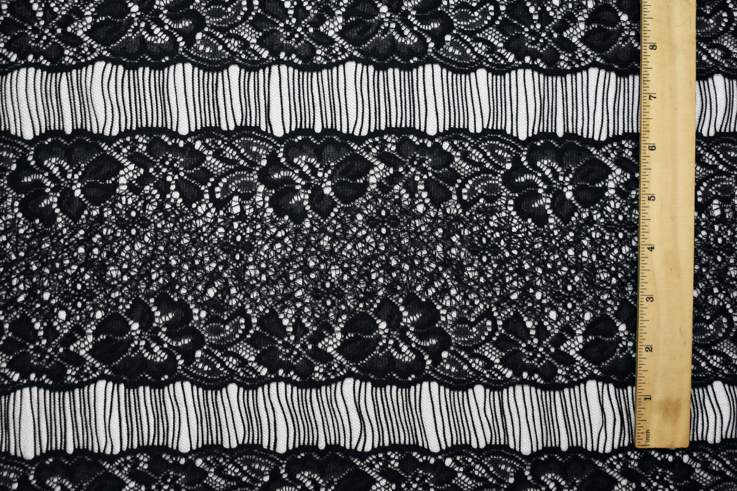 -100% Polyester floral lace pattern in a striped arrangement with alternating stripes in between