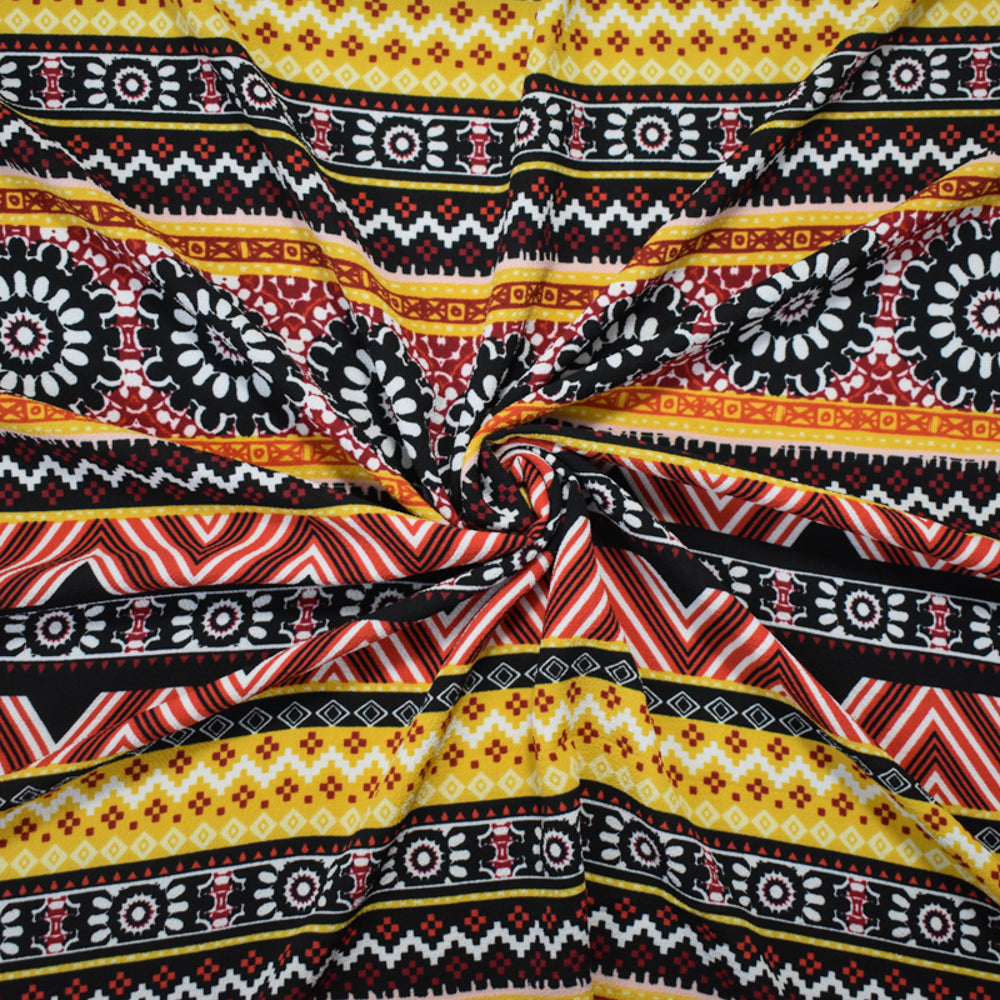 Red-Multi Poly Floral Aztec Stripe Border Printed Pebble Crepe Woven Fabric