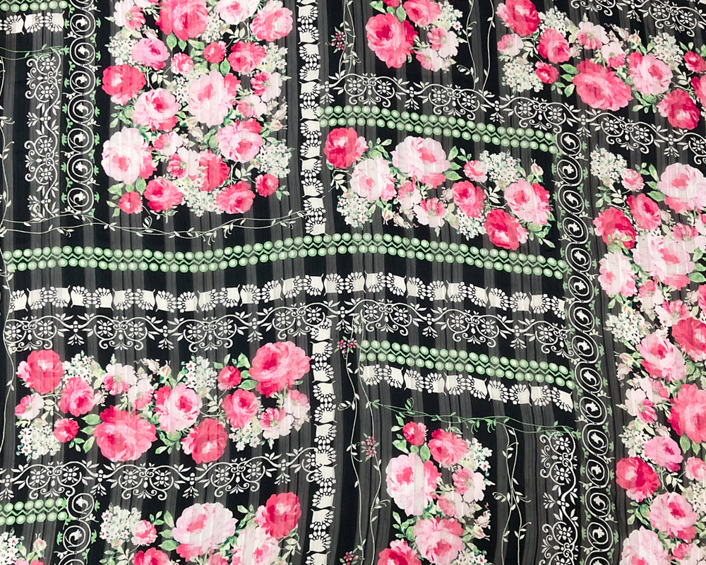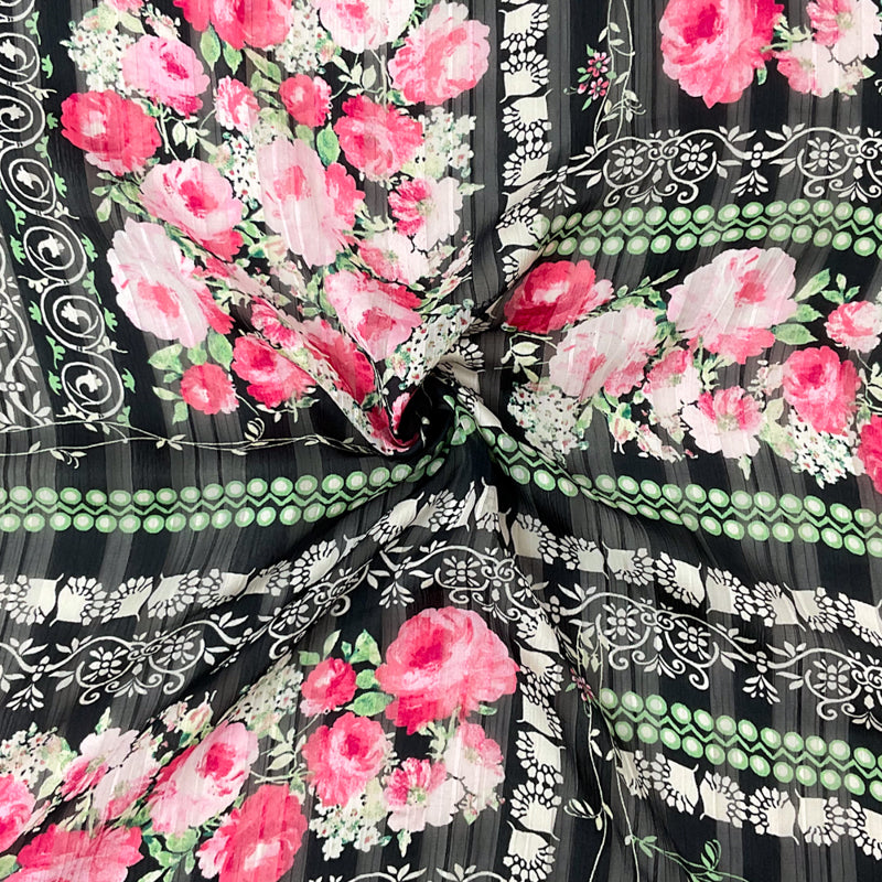 Black-Multi Poly Floral Printed Stripe Satin Chiffon Woven Fabric